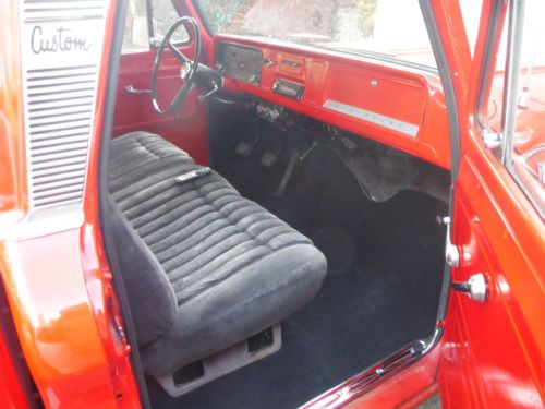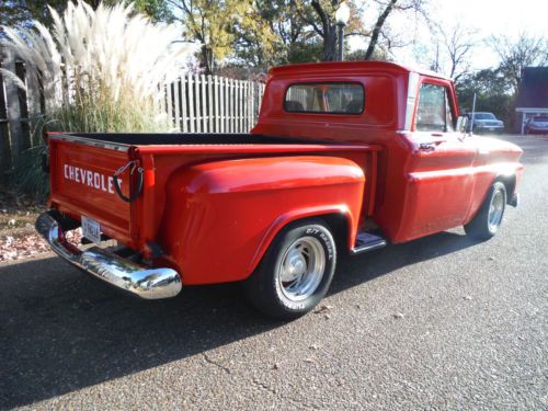 This is a 1965 Chevy short box custom cab. The c10 sports a 350 V8, standard shift on the column. It has a new edelbrock 4 barrel carburetor and aluminum intake. The dual exhaust is fairly new and sounds mean. There is a custom gas tank conversion, now has gas tank under the bed instead of behind the seat, for safety. The custom chrome gas filler is shown in the pics on rear fender. This truck also has disc brake conversion that makes stopping easy. This c10 has been partially restored. It has: new front and rear bumpers, new chrome emblems, new tailgate and latches, new windshield, new mirrors, new carpet, new chrome step mold and more. There has been a lot of money spent lately. There is some minor rust under the cab. The body mounts are perfect and it has solid floors. The truck has been lowered for the right appearance and it sits and looks great. Nice white letter tires. This is a great driver quality truck, not a show truck yet. It has an amateur paint job that looks great from a distance, but up close and only up close you can see imperfections. Needs stripped and repainted to be show worthy, or enjoy it like it is. The truck is turn key ready to enjoy now. There has been a ton spent on it, but it deserves a little more invested to be show quality. I'm going to let her go for a reasonable price.