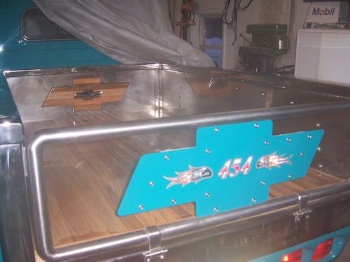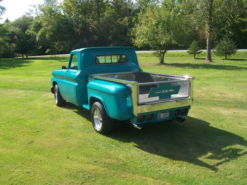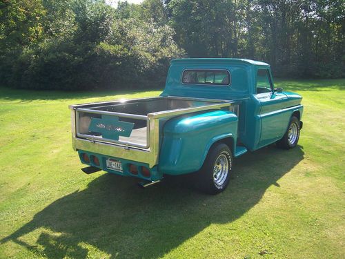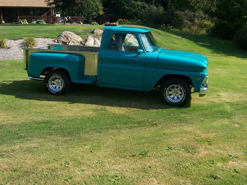 Selling my custom 1966 Chevrolet 1/2 ton step side pickup powered with a 450HP 454 with a 700R4 auto with over drive 12 bolt posi with 411 gears. Custom polished Stainless steel box with flow thru tail gate. Custom corvett rear lighting and custom flashing lights in the tail gate that lights the flames and the 454 cut out with red white and yellow flashing lights. The cab is all steel with shaved door handles and custom 1 piece power side windows. Also has a custom rear window with center sliding window. THe rear fenders are fiberglass as is the front fenders and hood. It has a customer hood release that operates by pushing the left front turn signal in to release the hood. Stainless steel battery tray and stainless steel 3 inch dual exaust and stainless 15 gallon fuel cell. Custom heavy duty $700 aluminum radiator with shroud and electric fan. Aluminum water pump and pulleys. Power steering and disk brakes on the front drum in the rear. I have spent allot of time and over $40K on parts and peices but it's time to sell it as I just don't have time to enjoy it. My reserve is low so bid to buy it!