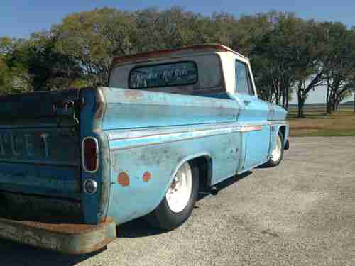 This is a really nice NO RESERVE original paint 1966 shortbed fleetside C10 pickup. This truck is very solid with only a small amount of rust, which is noted in the pictures. It has the unmistakable OG patina and looks really good. Please look at pictures carefully because they are part of the description. The motor is a 4 bolt main 350 with a turbo 400 trans out of a low mileage camaro. It is a very strong motor and trans shifts firm and strong. The motor has a polished highrise intake, edelbrock carb and polished billet air cleaner. The motor does have the patented chevy valve guide seal puff of smoke when you crank it up after it has been sitting for a few days, but does clear right up after initial crank up. I do have a video of truck running if you wanted me to text or email it. All dash gauges work, gas gauge, speedo, etc. Heat works as well as lights, brights and reverse lights, except no turn signals. The only thing the truck needs is a driver side door sill plate. Below is a list of things done to the truck in the past 3 months.