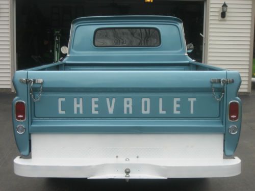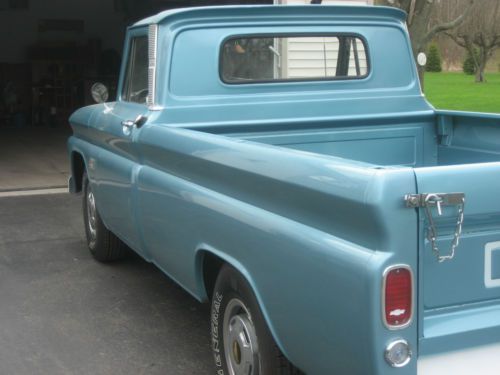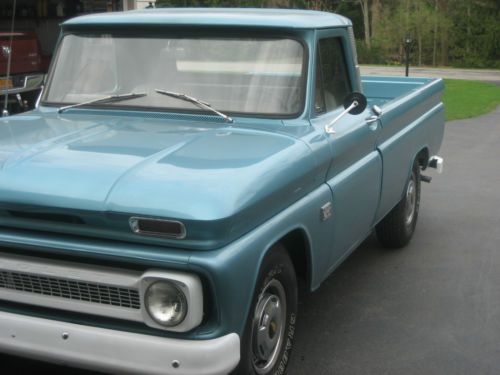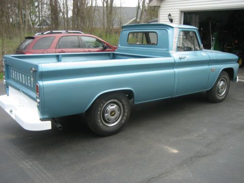 SELLING A VERY CLEAN 66' C20 CHEVY PICK UP, 283 C.I. ENGINE, 4 SPEED MANUAL TRANS. '' ON FLOOR'', BODY STRAIGHT, PAINT GOOD, NEW TIRES, BRAKES GOOD, WOOD FLOOR IN NICE SHAPE, SPARE TIRE, ALL LIGHT,HORN,WIPERS, HEATER WORK AS IT SHOULD, NEW EXHAUST, REAR STEP BUMPER, STARTS AND RUNS GREAT, GOES DOWN THE ROAD AND STOPS FINE, INTERIOR IS NICE AND CLEAN, GLASS GOOD, CHECK OUT THE PICTURES AND CONTACT JOHN AT 585 703 6663