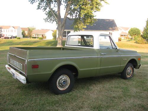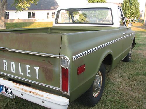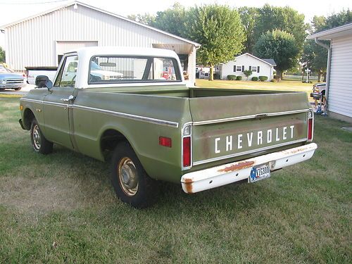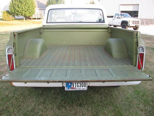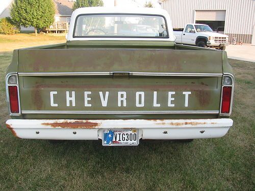 UP FOR SALE IS A 1969 C-10 SHORT FLEET SIDE BED PICKUP THAT SPENT ITS LIFE IN THE ATLANTA, GA. AREA UNTIL I PURCHASED IT ABOUT 6 MO. AGO. IT HAS A FACTORY CORRECT 250 CU. IN. 6 CYLINDER BACKED BY A 350 TURBO, NO POWER STEERING OR BRAKES. I HAVE INSTALLED ALL NEW BRAKE PARTS AND HOSES, REBUILT THE CARB, AND A NEW TAIL PIPE AND NEW MANIFOLD GASKETS. IT RUNS GREAT AND IT HAS ONLY 30100 MILES SO IT CAN BE DRIVEN ANYWHERE WITH CONFIDENCE. I HAVE IT FOR SALE LOCALLY FOR $11500. SO I RESERVE THE RIGHT TO END THIS SALE EARLY. IF YOU HAVE ANY QUESTIONS PLEASE CALL LEONARD AT 317 506 3330 IF YOU WANT TO MAKE A CASH OFFER, ALSO I HAVE A CLEAR INDIANA TITLE IN HAND, ALSO AS WITH ANY OLD VEHICLES IT IS SOLD AS IS NO WARRANTY,THANKS AND GOOD LUCK!