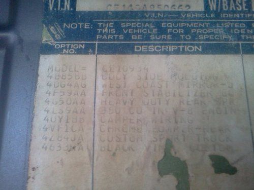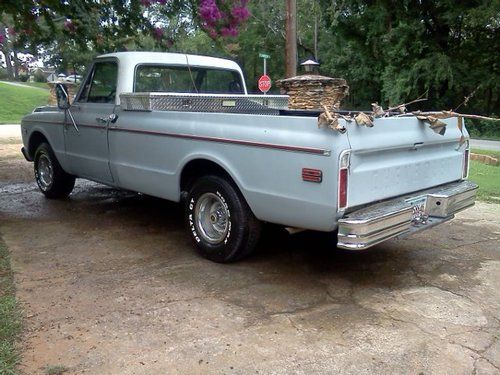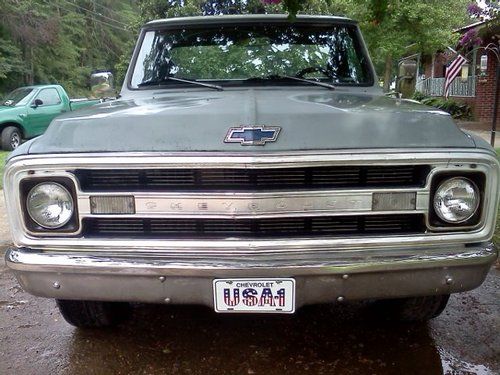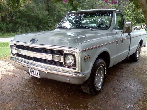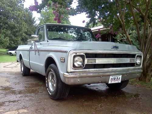 Up for auction is my 1969 Chevrolet CST Truck. It's Factory options include Body Side Molding, West Coast Mirrors, Front Stabilizer Bar, Heavy Duty Rear Springs, 350 CU Engine, Camper Wiring, Chrome Rear Bumper, Custom Sport Truck,Black Vinyl Custom Interior,Tinted Glass, Door Edge Guards (long gone) Can't make out the rest of the glove box data . Truck was originally a frost green color, has had one repaint, Over all the body is in very good shape, both rockers have been replaced, the bottoms of the doors have some rust, the truck bed is dented up but not rusted out, I believe they make a wood kit that goes over the top of the metal beds now. Very Wide rally wheels with brand new tires. I was making a 1970's type teenager truck out of it but I have 50's fever and a 57 ford sitting idle that I would like to restore, so this girl is up for auction. Engine runs good, still has old single quiet exhaust, 3 speed has been moved to the floor with a vintage shifter installed, seat is in nice shape, dash pad has a cover, nice truck mat in place, a little floor pan rust has been patched, truck needs new shocks, brakes want to pull to the right front a little, need bled and adjusted, heater works good, runs drives and shifts good, power steering, power brakes, lights work, turn signals work, horn works etc, Needs a good paint job, This truck has NO TITLE it is not required in Georgia on an antique. It is currently insured and registered to me, so your state will issue a title with my registration and bill of sale. Ask any questions prior to bidding full payment is due within 5 days of auction end, do not bid hoping to have the money to buy, bid only if you are serious and have the funds, Once I am paid you may have as long as needed to arrange pick up, yes You can drive it home, i drive it everywhere, mileage is most likely 140,000 . Thanks