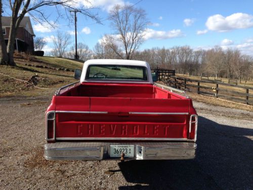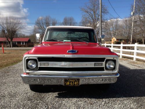 1970 Chevy C-10 the only year Chevy put the Bow-Tie on the Hood! Very collectible. Been tinkering on her a while and ready to let her go to a new daddy or mama that wants a REAL muscle Truck! I got her off a car lot a few years back and here's the good...Put a new 350 long block in her last summer ( 2 yrs left on warranty from O'reillys ) had the 400 turbo Transmission rebuilt at the same time and added a new Edelbrock 650 4bbl Carb so she will scoot! Had the bench seat recovered. I have white door panels and new handles that I have not installed. New Windshield. Replaced front end rods and drive box. New Brakes , lines Master cylinder. New Waterpump and Radiator. New alternator and Power Steering pump ( all with lifetime warranty at O'Reillys ) Bad. Needs a/c heater system new core installed. Needs a front end alignment and a new left front tire and I would drive it anywhere. Got a new CD payed and speakers so its a rolling jukebox. Of course there's rust and the Divers side rear quarter panel needs some body work. Dents and Scratches... Hell it's 44 years old. Original Tennessee Truck original color colors were hugger orange and white (GO VOLS) I guess some dang ALABAMA fan painted it Crimson! Gonna sell her at auction with reserve. I call her REBA!