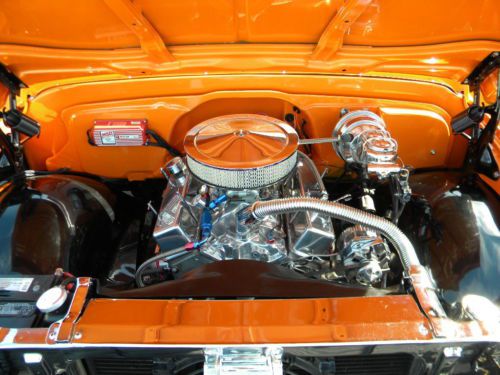 Running Gear: Built 350 SBC CK block with nice street cam. Aluminum heads (EC 200) and Edelbrock aluminum intake. Holley dual feed. MSD billet distributor, 6A amp and wires. Ceramic coating shorty headers, electric pusher fan w/HD 4 core radiator. Runs cool. The trans is a rebuilt TH 400 with shift kit. Rear end is a Ford 9 inch with mid range gears. 100 amp chrome alternator.