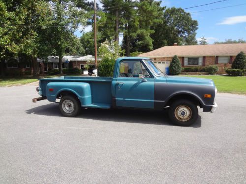 Up for sale is a 1971 Chevy step side P/U. It is a drivable truck in fair shape for its age. The whole cab floor has been replaced professionally and came from LMC. At the same time the cab corners, rockers and fenders were replaced. Power steering and power brakes were added. New Edelbrock carb, new radiator, fresh tune up, pointless ignition system. Not the original wood slats in bed. Truck needs to have finishing touches put on her. Would make a safe drivable project, rat rod or great father son project. Gauges all work, all lights work, horn not working(needs a new steering wheel), no radio, no A/C and heat works. Windshield is not broken but will need to be replaced at some time because the edges are turning white just depends on your state and inspection laws. If you want to know more just ask away. Truck is located in Virginia Beach, Virginia. If you want to take a look at her just let me know threw E-BAY e-mail system. |
