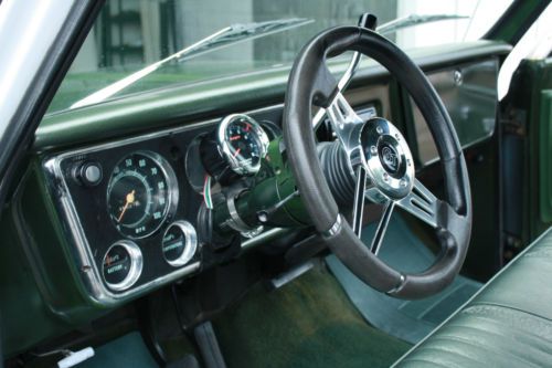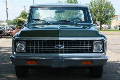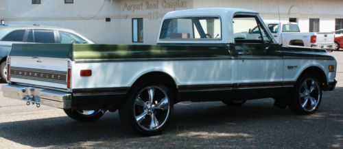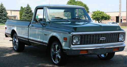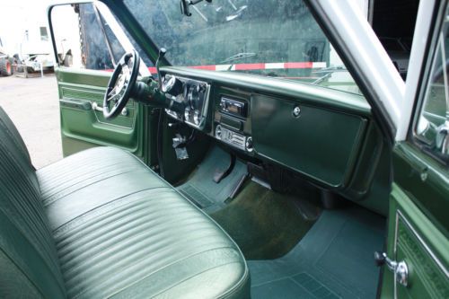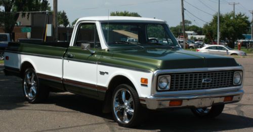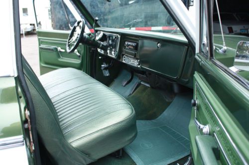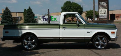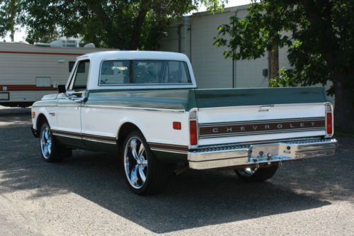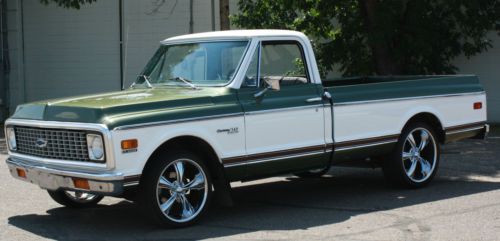 VERY NICE 1972 CHEVROLET C10 CUSTOM DELUXE ORIGINAL PAINT AND INTERIOR, KEPT IN VERY NICE CONDITION OLIVE GREEN AND WHITE FACTORY COLORS POWER STEERING AND POWER BRAKES 350 V8 WITH 350 AUTO TRANSMISSION CUSTOM NEWER DUAL EXHAUST GRANT STEERING WHEEL AND SUN PRO TACH CD PLAYER SITTING ON NANKING TIRES 255X35 ZR 20 FRONT AND 295X35X22 REAR MOUNTED ON BOSS 338 RIMS 20X8.5 FRONT AND 22X10 REAR SUPER STRAIGHT BODY WITH NO RUST ISSUES, SOLID FLOORS, CAB CORNERS AND DOOR BOTTOMS GREAT LOOKING TRUCK, DRIVES SMOOTH AND EASY, DRIVE ANYWHERE SHOW ANYWHERE ANY QUESTIONS EMAIL ME OR CALL ME JIM AT 720-352-3991 SHIPPING QUOTES AVALIABLE THANKS FOR LOOKING On Sep-10-14 at 11:51:04 PDT, seller added the following information: CORRECTION: THIS IS A COMPLETE REPAINT AND A VERY NICE JOB |