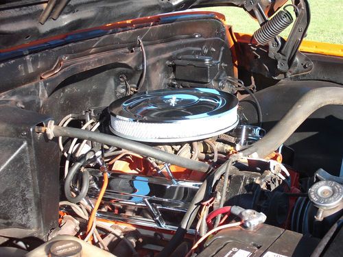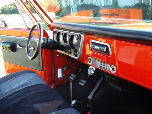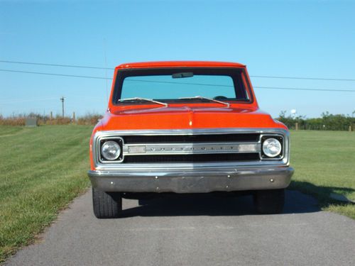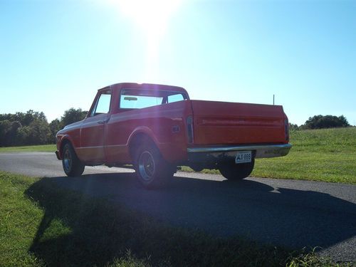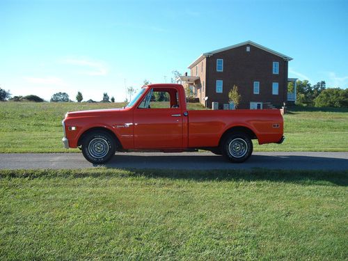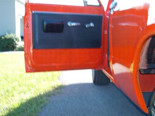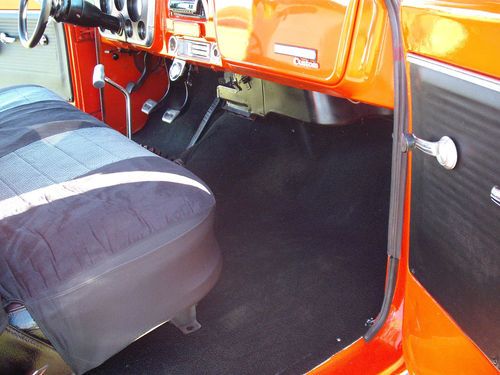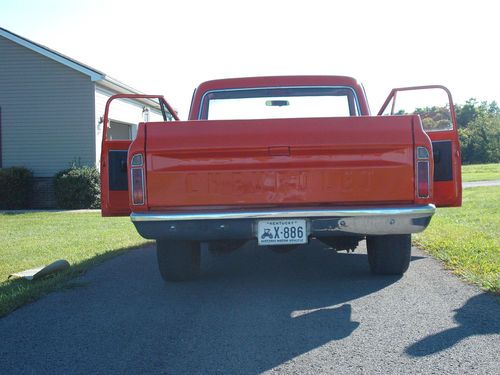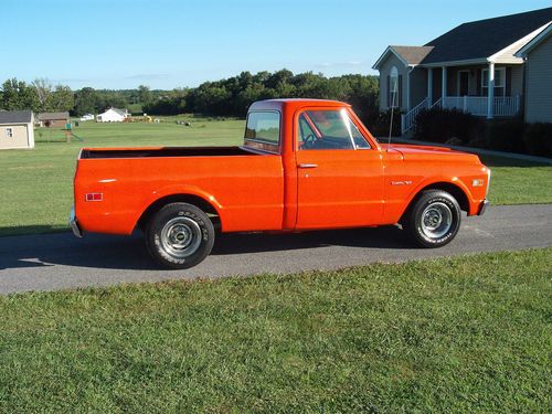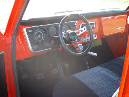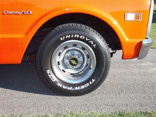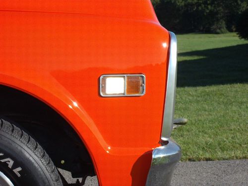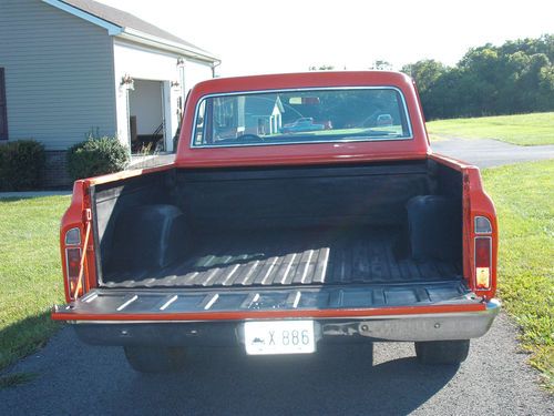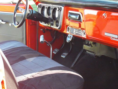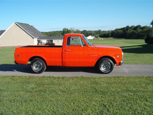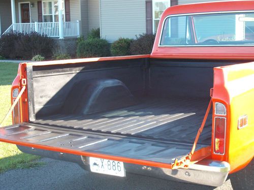 This 1972 Chevy Custom 10 is cloned from a 1972 GMC. It has had a frame on restoration inside and out. It is a short bed fleet side with new paint (hugger orange inside and out). It has a rebuilt Chevy engine, new clutch, pressure plate, and 3 speed manual transmission floor shifter. It has power steering, rally wheels, and a spray in bed liner. The vehicle runs and drives good. It has a new dual exhaust with headers. The engine has been chromed out. Truck will be titled as a 72 GMC.
