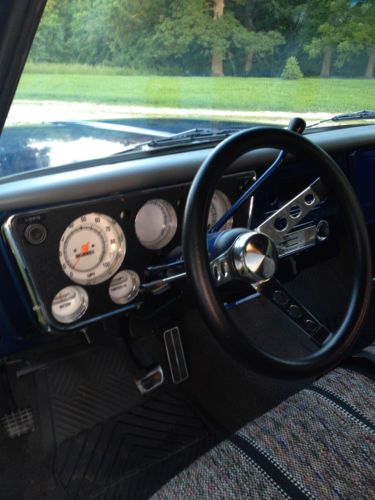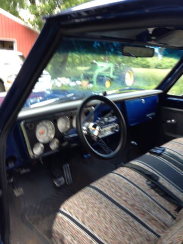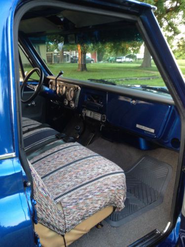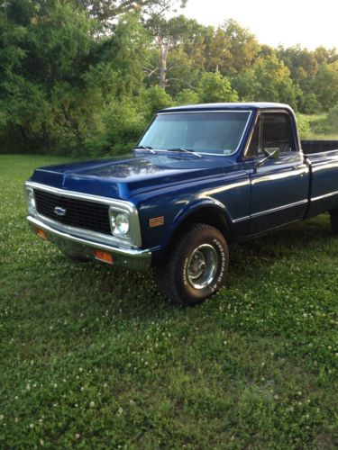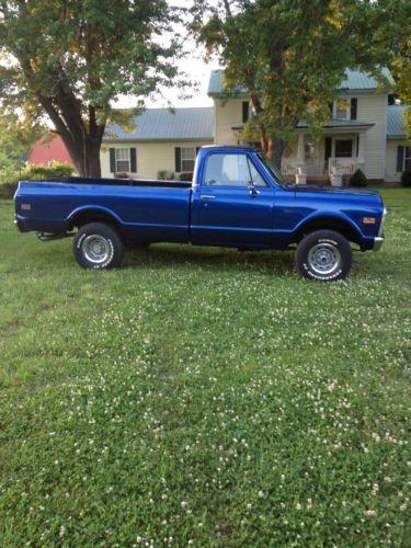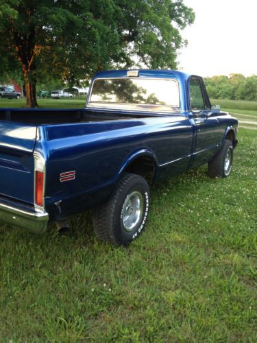 1972 Chevy Longbed original 4wd truck, i bought this truck from a guy who spent countless hours getting it into the shape its in which is beautiful, the body was taken down to bare metal, any imperfections were fixed, and painted a 2009 ford mustang vista blue metallic base coat clear coat, it shines and looks great, there is a small scrape on the rear bed i will show it in the pics, undercoating was applied under the cab and bed, as far as new parts heres the list hope i can remember all of it, bumpers, all weatherstripping, windshield, door handles, window cranks, all lights,carpet,gauges, dome light, dash pad, visors, exhaust with flowmasters and chrome tips, trailer hitch,tires are excellent,dash is uncut for original radio if you wanted, tilt wheel, wiper arms, chrome around windshield, looks to have new brakes, engine is a later 350 with a turbo 350 both rebuilt with approx 1000 miles, new seals on rear and front end, and transfer case, the seat is in good shape just the wrong color never got to that point yet, the engine has a hi rise manifold with a good running qjet carb, the truck runs and drives flawlessly, everything works great, this is one nice truck, it needs the side emblems, the inside of the bed has never been rhino lined or anything like that, only has a couple of dings, i have the truck for sale locally so reserve the right to end auction early, not to many around like this at what i think is a fair price, not giving it away, good luck on bidding and thanks for looking.