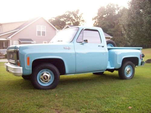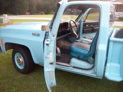 1974 CHEVROLET CUSTOM 10, C-10, STEP SIDE TRUCK. 32K MI. SHOULD BE ORIGINAL, IT WAS A FARM TRUCK MOST ALL OF ITS LIFE HERE IN SOUTH CAROLINA. ORIGINAL OWNERS MAUAL STILL IN THE DASH, 250 CYL. 3-SPEED MANUAL ON THE TREE. DRIVES OUT GREAT AND RUNS WELL. PAINT IS GOOD BUT NOT PERFECT. IT COULD USE A CUT AND BUFF TO BE BETTER. VERY SOLID BODY AND CHASSIS BUT HAS THE TYPICAL SURFACE RUST IN A FEW PLACES. THE BED HAS ORIGINAL WOOD THAT HAS ALSO BEEN PAINTED.
