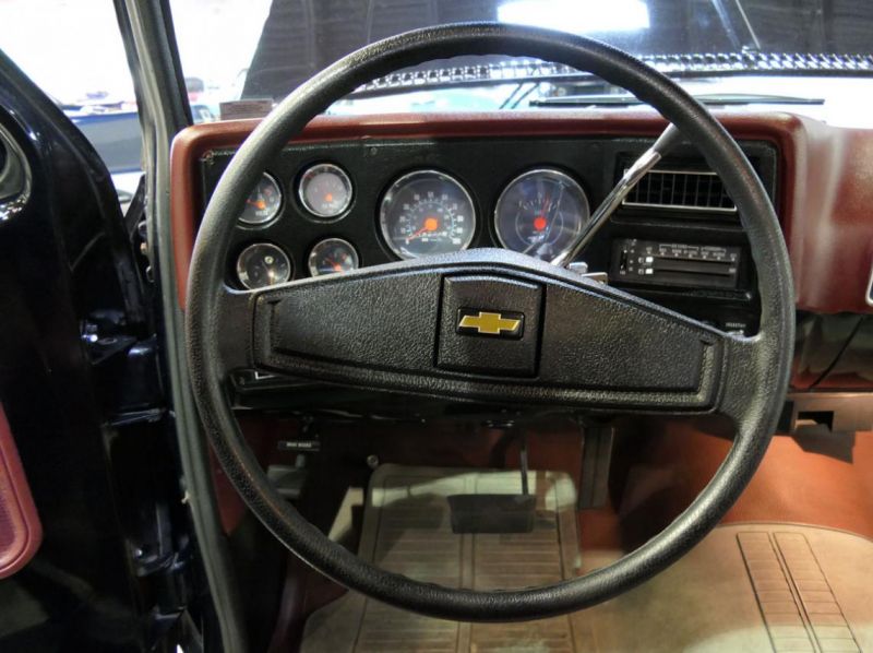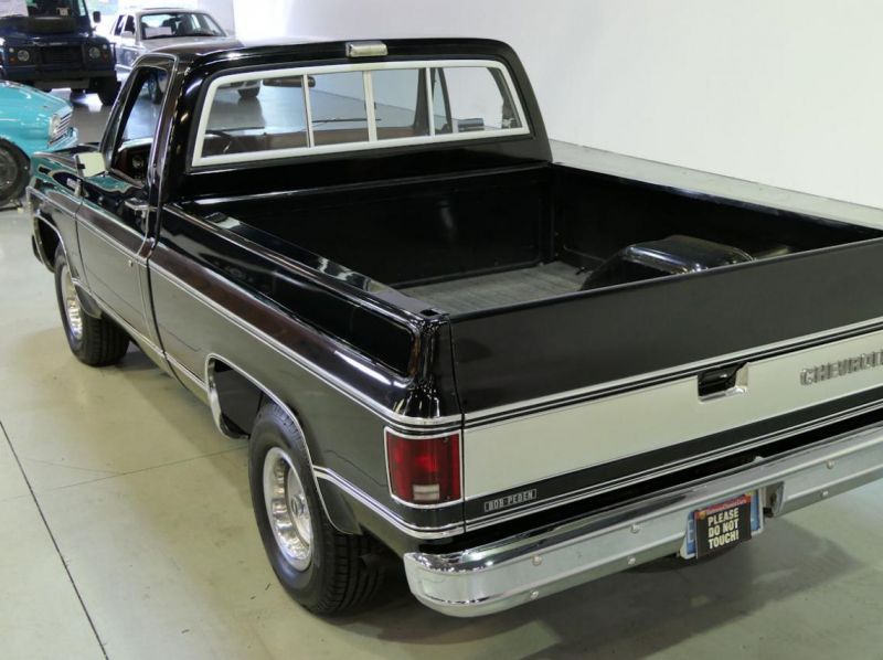 Sitting under the hood of this classic Chevrolet is a powerful numbers matching 350 cubic inch V-8 engine that is mated to a turbo 400 automatic transmission. This truck is basically a time capsule and has been well maintained since day 1. It features A/C, Power steering, power brakes, am-fm cassette radio. The odometer reads a little over 18k miles on this beautiful Black truck with Red Vinyl interior.