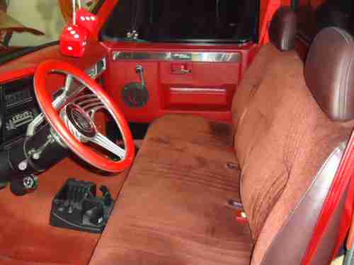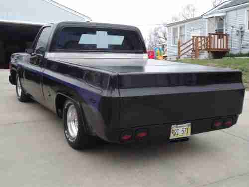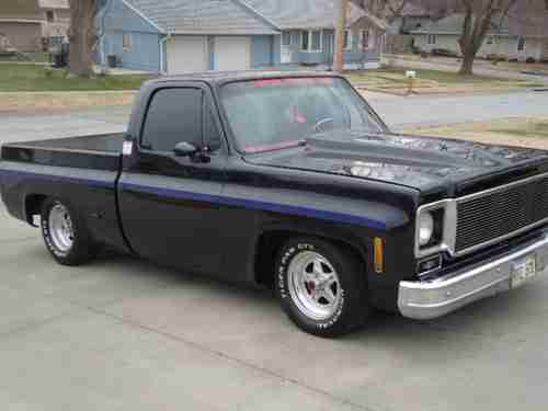 I have a 78 chevy shortbox for sale. The truck has been prof. lowered,the rear frame has been c-notched and the axle has been put on top of the springs for the ride height. The front end has been lowered 2 inches.The wheels are weld pro stars with newer uniroyal tires.The exhaust is flowmaster super 40 mufflers with corvette chrome tips under the corvette rollpan.The motor is a 350 built stock,all painted with edelbrock carb,polished edel. intake,polished aluminum flamed valve covers and same plug wire holders.The air cleaner lid is custom air brushed with chevy bowtie and flames. The batterybox is polished alum. with ol'school pinstriped.The truck has NO rust and new paint,its midnight black metallic,with a plum crazy purple stripe.The interior is perfect with stainless trim inserts and polished aluminum wheel and shifter.The trans is 3 speed automatic that has a shift kit and rebuilt.The rearend has a spool with 373 gears.There is alot of chrome on the motor,the inside of box is carpeted with stainless inserts on tailgate and front of box.Has a custom built cover that hinges on the top of box.It has arp bolts and high performance parts in the engine.The truck runs,drives and looks awesome.If any questions text me,402-601-5798.Im open to offers if doesnt meet the reserve.My reserve is LOWER than my appraisel. Also the whole frame and bottom of truck is painted along with engine compartment.