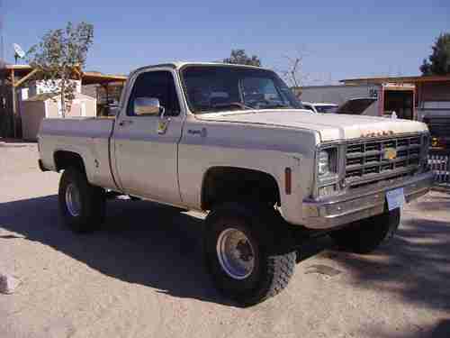 1979 Chevy C-10, 4x4 short bed, 3 speed automatic. Truck is lifted 4-6 inches and has big tires and wheels with 70% tread.