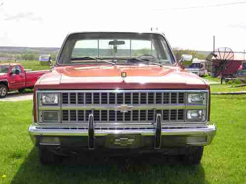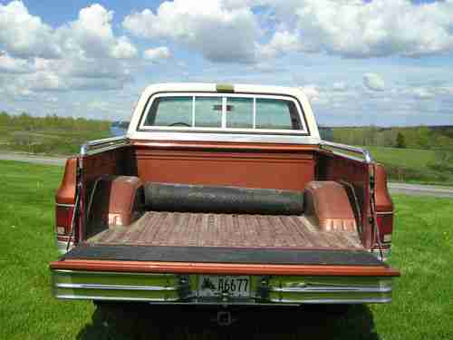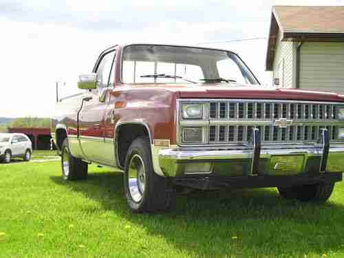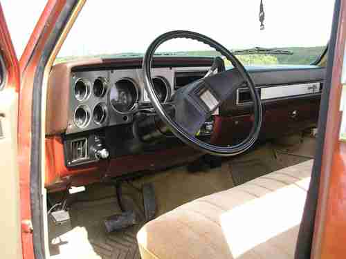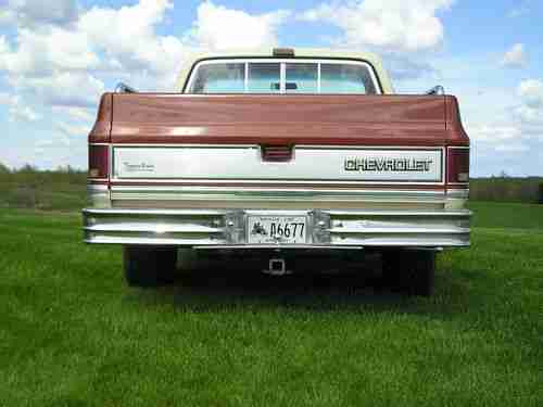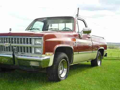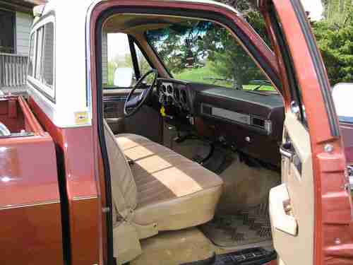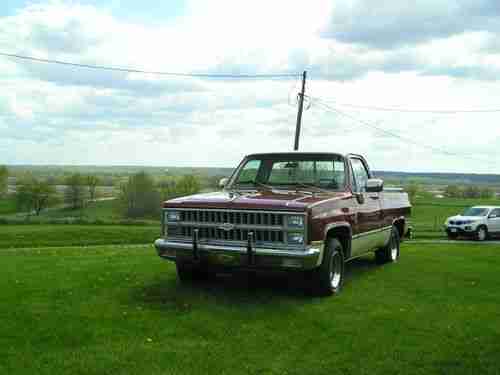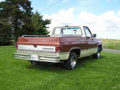 Here is my very nice 1982 shortbed Silverado truck. It is the last year for turn signals in the front bumper, plus it's the second year for the tapered front fenders. This year is so popular that LMC Truck Parts even offers a kit to change the 1983 through 1987 to turn signals in the front bumper like the '81-'82 to get that look. For this year, this truck is loaded with factory options: automatic transmission, power steering, power front disc brakes, tilt column, cruise control, delay wipers, air conditioning (already converted to R134 freon), factory sliding rear window, electric windows, electric locks, AM radio, full gauge package, ralley wheels, deluxe two-tone paint job (original color combination), plus top of the line Silverado trim. The paint on this truck is five years old, base coat/clear coat. It has some minor scratches, most you could buff out. The paint job is a solid 8 on a 1 to 10 scale. The color is a light brown and cream on bottom and top. Very nice original color combination. The inside of the bed was not painted, the floor has had a rubber mat since it was new, it is not dented or bent up. It looks great. In the last year, I have installed new belt line molding, wheel opening moldings, trim rings, center caps, lug nuts, door weather strips, new window channels, window fuzzies and seals,plus new wing vent seals, also new brushed aluminum gauge panel, new door panels. Truck has a Pioneer AM-FM CD player with speakers in the dash and behind the seat and also has chrome bed rails. This truck runs, rides and drives as good as my 2009 Chevy truck. This truck was purchased in Arkansas where I was told it spent most of its life and that the drive train is original and had no rust. I did not see any rust when I purchased it, and I don't see any now. In my opinion, it appears the engine and trans and rear end have never been out. All gauges work as they should. AC blows cold. Heat, wipers, horn, lights, turn signals all work. Tires are 65%. The dual exhaust is in good shape. Would not be afraid to drive this truck anywhere. I have over 30 years in auto body and paint work and mechanics. It will be as advertised. Any questions? Email or call: 660-355-4571 after 5:00 p.m. CT.
