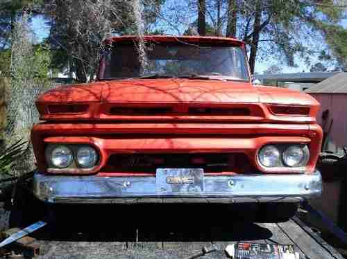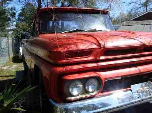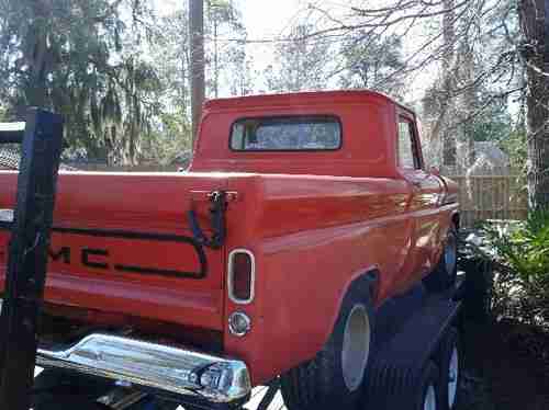 UP FOR AUCTION IS A 66 GMC SHORTBED, I BOUGHT THIS TRUCK TO RETORE BUT FOUND THE ACTUAL TRUCK I WAS LOOKING FOR. THE TRUCK HAVE A VERY SOLID BODY WITH THE REGULAR RUST IN THE NORMAL SPOTS FOR THESE TRUCKS, THE BED IS METAL. IT HAS BEEN CONVERTED TO 5 LUGS. THE INTERIOR DASH HAD BEEN CHANGE BY THE PREVIOUS OWNER BUT FROM WHAT I NOTICE ALL THE DASH GUAGES WORKS FINE. THE TRUCK IS A PROJECT TRUCK, IT RUNS VERY GOOD, IT CURRENTLY HAS A 350 WITH VICTOR JR INTAKE AND A 600 EDELBROK CARB, THE TRANSMISSION IS A 700R4 , IT DOES HAVE A LOT OF POWER, IT HAS HEADERS AND DUAL EXHAUST FROM FRONT TO REAR. IF YOU HAVE ANY QUESTIONS PLEASE FEEL FREE TO ASK THEM AT ANY TIME. IF YOU WANT TO MAKE A RAT ROD THIS IS PERFECT - IF YOU HAVE AN ENGINE THAT YOU WANT TO PUT IN I WILL CONSIDER SELLING THE TRUCK BODY ONLY JUST GIVE ME A CALL 912-492-1314 (ROBERT)