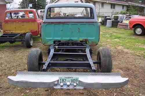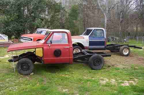 72' Has been taken down to the frame, pressure washed/cleaned/sand blasted/painted, & put back with all new front end/steering/suspension parts, rear control arms/bushings new, all coil springs new, set up with power steering, front disc/rear drum brake all new, 5 hole wheels, all is solid & tight. This cab has also had some body work, but like the 69', could use some touching up. Floor pans and rockers are new, doors & hood are decent, hood has small ding on very front, no front fenders, no engine/trans, rear end seems to be in good shape. Missing windshield, but all other glass is there.