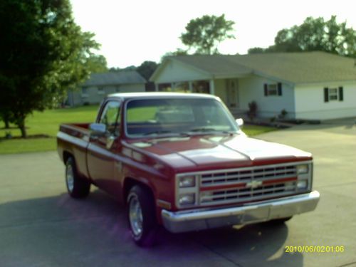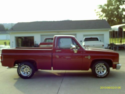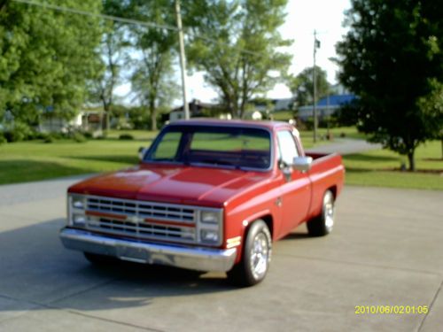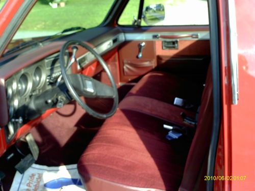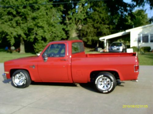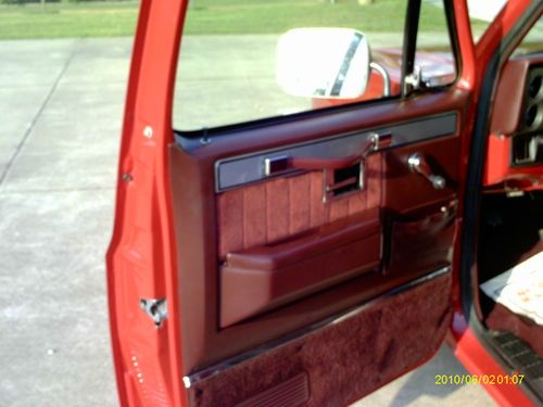 THIS IS A EXTREMELY NICE 87 CHEVY SILVERADO SHORT BED PICK-UP , IT IS A 1 - OWNER SOUTH CAROLINA RUST FREE TRUCK WITH 71000 MILES . IT HAS HAD A COMPLETE FRAME OFF RECONDITION , THE FRAME WAS COMPLETELY SAND BLASTED AND INDUSTRIAL COATED THE BODY WAS 100 PERCENT RUST FREE , AND WAS COMPLETELY STRIPPED OF PAINT . IT WAS PAINTED WITH CODE ( 72 ) BRIGHT RED , IT WAS PAINTED INSIDE AND OUT , UNDERSIDE INCLUDED. IT WAS ASSEMBLED AFTER PAINTED . THE TRUCK HAS BRAND NEW INTERIOR , NEW ( GM ) DASH PAD , DOOR PANELS , AND ORIGINAL ( NOS ) SEAT MATERIAL , NEW CARPET , NEW HEADLINER , AND THE WORKS , ( EVERYTHING NEW ) . IT HAS NEW WHEELS AND WHITE LETTER TIRES , NEW BELL- TECH 3-4 LOWERING KIT , NEW MONROE SHOCKS , NEW EXHAUST WITH DUAL TAILPIPES THAT EXIT THE BACK BY THE ROLLPAN . TRUCK IS VERY HIGHLY DETAILED AND LOOKS BETTER THAN WHEN IT ROLLED OFF THE ASSEMBLY LINE . CHECK OUT THE PICTURES OF THE EXTENSIVE DETAIL , THANKS FOR VIEWING MY LISTING AND IF YOU MIGHT HAVE QUESTIONS , ( PLEASE ) DONT BE AFRAID TO ASK .....THANKS ROD ........HAVE A GREAT DAY !!!!!