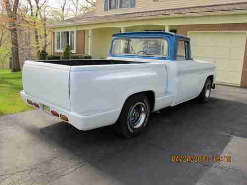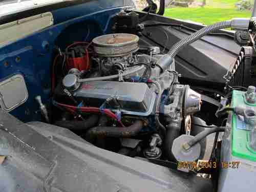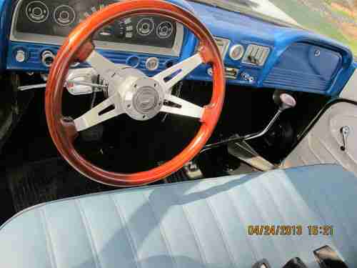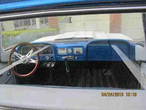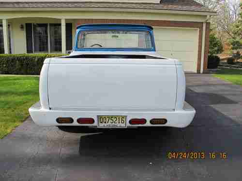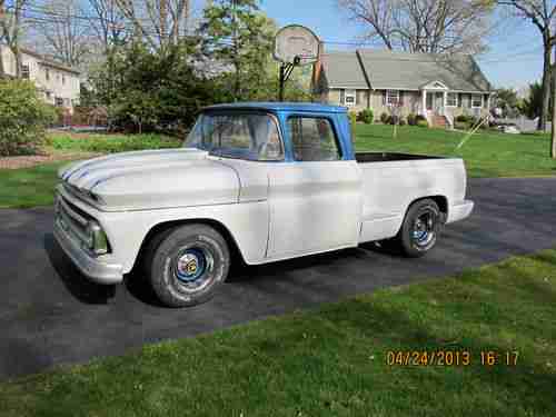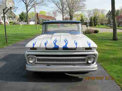 1963 Chevrolet C10 Pickup (1964 Grille) large back window, bed is from a later model Chevrolet pickup. Engine is a 305 CI 4 barrel carb. Transmission is a rebuilt turbo 350. Has new tires, Front has disc brakes, New bench seat. Front and rear lowering kits. The hood , bumper and front fenders are fiberglass.Exhaust is complete with side outlets.Truck is painted 2010 Corvette white with a blue metal flake roof all base coat clear coat. Doors have remote poppers(no door handles) the cab is solid.