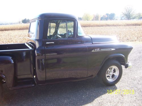 Up for bid is a 1956 Chevrolet 3100 short bed step side pickup. This truck received a complete Frame off restoration two years ago and has had about 1600 miles put on it since completion. The engine is a .030 over 350 four bolt main block with a Skat crank, flat top pistons, a mild hydraulic camshaft, aluminum intake and a 600 Holley carburetor. The engine is backed up by a 700R4 automatic transmission and a stout ford 9 inch built with a powertrax locker,4:10 gears and a pair of strange axles. The exhaust is a set of ceramic coated headers going back to a pair of flow master mufflers. The frame is rebuilt original with the addition of power steering ,power disk brakes, and front and rear sway bars all from CPP. The body was redone and painted in Black Cherry base coat clear coat and is topped off with all new chrome and weather stripping. The front and rear windows are new as well as the oak flooring in the bed and the stainless hardware. The truck rolls on new Torque thrust wheels wrapped wit BF Goodrich radial T.A. Tires. The interior has a new headliner, new door panels, and the original seat has been redone. The interior also has an Ididit tilt steering column added and a Clarion CD player with new kick panels with built in speakers. It would be easier to list what isn't new so I am sure I am forgetting something. If you are a serious buyer feel free to call me with any questions. I have 100% positive feed back and would like to keep it that way. My number is 1-330-401-2880 .Truck will not ship and title will not be transferred until all funds clear. Buyer responsible for shipping. I reserve the right to end the auction at any time. |