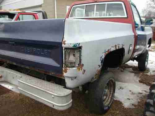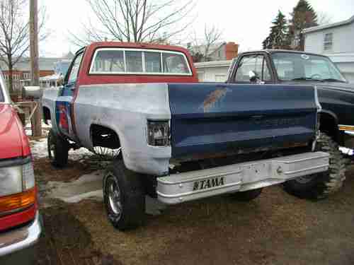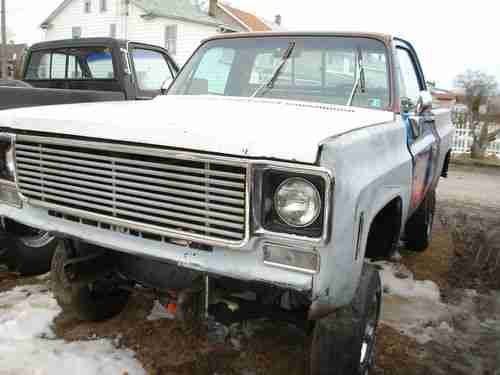 up for bid is a project 1975 chevy shortbed.no motor or trans now orig a 350 auto setup.worse part of truck is cab,needs floors mounts rockers and cabcorners,bedsides have holes above wheels and under tailgate but floor and crossmembers are perfect.doors are rust free driver side has dent most of it will pop out,front fenders are new driverside has dent ,hood is nice and straight.frame is beautiful.cab and front end are not completely bolted down,good enough to trailer or rollback home dana 44 front rear and 12 bolt back with 3.73 gears.truck is lifted 7 inches 4 inch susp and 3 inch body.dual schocks front and rear i have a turbo 350 trans with a 205 transfercase avail for $300 if buyer wants,or a granny low 4sp and 208 setup for $200.truck has clear title..perfect mudbog offroad or restoration project these shortbeds are getting hard to find with a good frame.call 570-294-5323 for more info or ?'s