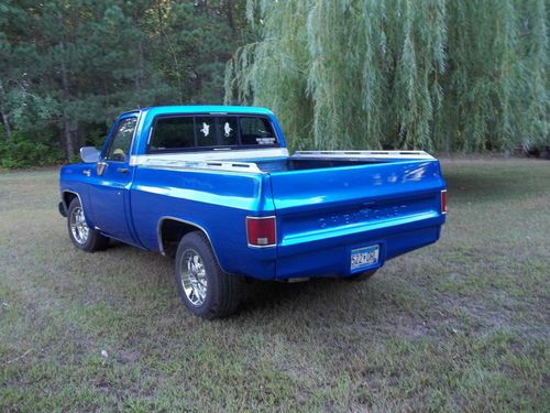 im selling my short box chevy truck it has some wear on the paint and a few little dings and scratches in the body with no rust. The truck is a total custom 2 wheel drive with a 5.3L ls engine with a 700r4 trans and a ford 9" with 3.77 gears and disc breaks, with the chevy bolt pattern for the wheels .Lowered 2 inches with chrome 17in rims with toyo tires The front end has completely been rebuilt with new power steering box . The fuel tank has been moved to the rear and filler neck moved to the inside of the box. has custom dual exhaust with an X pipe and cutouts and cambered mufflers.