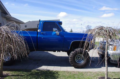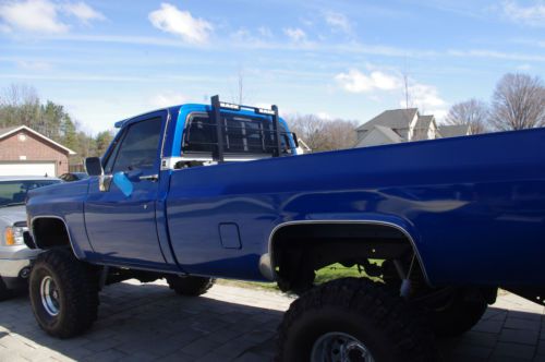 Fairly well done 79 Chevy 4x4. Has 350 engine, auto trans, full time transfer case. No front driveshaft in it at the moment as the guy I got it from never lengthened one to compensate for the lift (has body and suspension). Super Swamper Bogger tires. I haven't done the driveshaft yet either because I never intended to 4 wheel it anyways, and it would be harder on fuel with the full time case in it. The interior has a good seat, decent door panels, and new carpet, but the last owner painted the dash and it's starting to peel. Has a GMC grille in it, but I have a new correct Chev grille that will go with the truck. Truck runs and drives decent, but trying to listen to the stereo over the noise of the exhaust and tires is pretty much a waste of time! :) New Backrack just installed, tires are basically new, paint is new, don't know of anything else it needs other than what I've mentioned. True mileage unknown. Buyer is responsible for shipping or pickup.