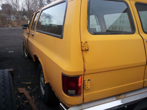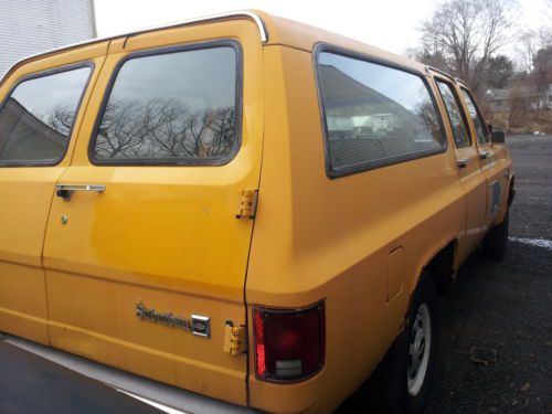 THIS IS A 1984 CHEVY SUBURBAN, WAS A TOWN OWNED VEHICLE FOR SURVEY CREW. TRUCK DOES NOT RUN NEEDS TUNE UP AND EXAUST SYSTEM. BODY IS IN NICE SHAPE FOR AGE SOME RUST ON BACK FENDERS(SEE PIC) THE ONLY DENT SEEN IS ON THE DRIVERS DOOR. TIRES ARE 50% SOLD WITH CERTIFACATE OF ORIGIN NEVER REGISTERED. TRUCK MUST BE TOWED. SOLD AS IS WHERE IS. NO WARRANTY. ALL SALES FINAL.