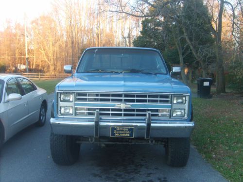 1986 Chevy 4x4 lifted located in Townsend, Delaware good truck runs and drives needs bigger fuel filter, and 4x4 looked at other than that this is a great truck in decent shape for the year. solid rocker panels paint job is 6 years old rust in the bed a little . would make a great pull truck or weekend warior truck interior is good except the normal crack in the dash from these trucks . truck is registered as a antique in delaware so no inspections . any questions call chris 302-357-0075 please no bs . pickup only no or by the the buyer. sold as is . simply because it is an 86 . power windows locks extra gauges . they work and lite up .