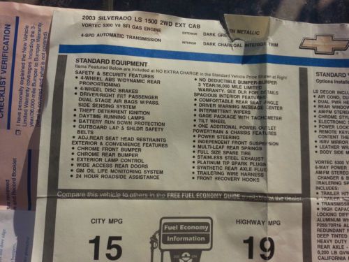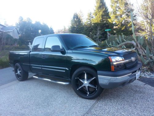 2003 CHEVY TRUCK SILVERADO LS 1500 EXT CAB MINT THIS IS A VERY NICE TRUCK, AND HAS BEEN WITH OUR FAMILY IN CALIFORNIA ALL ITS LIFE. THE TRUCK HAS NOT BEEN IN ANY ACCIDENT, AND DARK GREEN METALLIC PAINT WITH DARK CHARCOAL INTERIOR UPOLSTERY SEATS THAT HAVE BEEN PROTECTED ALL ITS LIFE, THUS THEY ARE LIKE BRAND NEW! THE ENGINE IS 5.3 LITER V8 ENGINE WITH FUEL INJECTION, AND GETS 19 MILES PER GALLON ON THE HIGHWAY. THE TRUCK A;SP HAS THESE NICE FEATURES. THE TRUCK IS CURRENTLY REGISTERED BUT NOT DRIVED MUCH AND REASON FOR SELLING. HE TRUCK HAS 119,000 AND HAS BEEN WELL TAKEN CARE OF AS WELL.: VIN NUMBER: 2GCEC19T531283178 · REAR BED COVER, AND JUST HAD IT REPAINTED TO MATCH THE TRUCK, THUS LIKE BRAND NEW! · BED LINER (BLACK) · 22” WHEEL (NICE LOOKING, EASY TO CLEAN, AND WERE EXPENSIVE IF YOU HAVE TO BUY ANYTHING SIMILAR) · BRAND NEW HIGH END 22” TIRES (TOYO) · 4 WHEEL DISC BRAKES · POWER STEERING · AIR CONDITIONING · HEATER · REMOTE KEY ENTRY · AM/FM W/ 6 DISC-CD · TRAILER HITCH · STILL HAVE THE ORIGINAL ALUMINUM WHEELS · TINTED WINDOWS · HEAVY DUTY SUS[ENSION · ALARM · TILT WHEEL · NEW BATTERY |