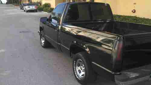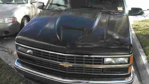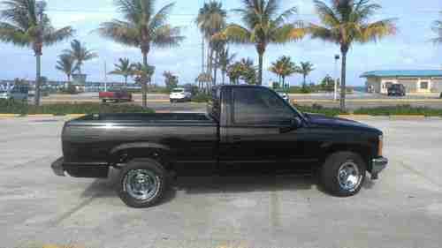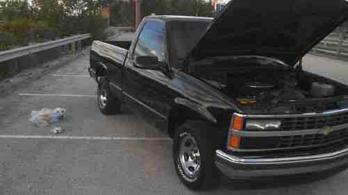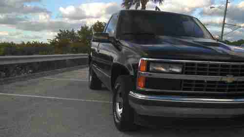 1991 Chevy short bed c1500.5.7liter 350.... been an on going project and is almost done.. I would say 95% done. There are few things left to fix. It is my daily driver. It is head turner not your everyday truck. I find this truck very reliable. It has the deep chevy rumble and a joy to drive. There newer Bf Goodrich tires on the ss rims with plenty of tread left. I was going for the ss look. I am took the interior down to the bare crank windows and bench seat and removed the red headliner. I like the strip down look better. The paint is fresh with a few dings from other assholes hitting the truck with a door or shoping cart. The transmission was rebuilt by gold coast transmission last year. There is a new two row radiator installed and keeps the truck cool. It stays right at 190degrees if you wanted it cooler just put a lower temp thermostat in. I just have lap belts in the truck if you get pulled over the officer might say, "where is the shoulder belt?"
