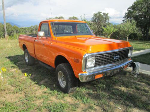 1972 Chevrolet CKE10 Short Bed Pickup. I have a clear title in my name. This is a good running, daily driver, Chevrolet Pickup. It has the short bed, four wheel drive and a four speed manual transmission. The truck has its original engine and transmission. You could fly into Salt Lake City and drive this truck anywhere. Please look closely at all of the photos. The truck still needs some work, but nothing major. The truck has a new grille, new front bumper, new seat cover, and new cab mounts that were professionally installed. All of the glass is good and the tires have good tread. The truck has power steering and power brakes that work properly. The paint is new and looks very good, but is not show quality. Please look closely at all of the photos. I want the new owner to know exactly what they are buying. I highly value my 100% 685 positive feedback score on Ebay. The reserve on the truck is will under the trucks value. If you have any questions, or concerns, please don't hesitate to give me a call. My phone number is (801) 745-5835. I'm not a dealer. I love old cars and trucks and I have to sell one of my projects. The original Shop Manual comes with the Truck. I will gladly assist the shipper you select to ship the truck anywhere in the world.