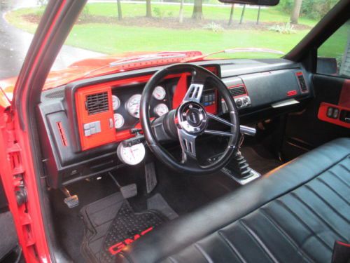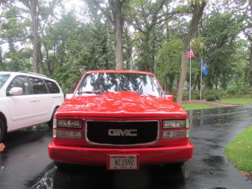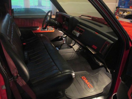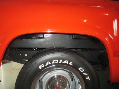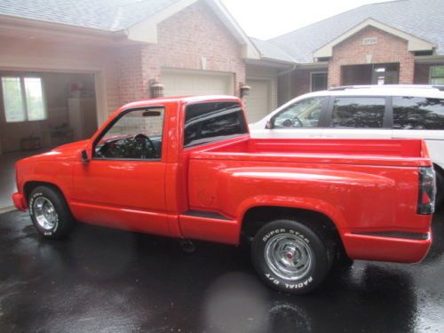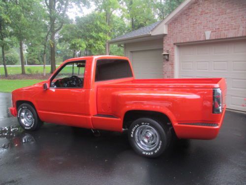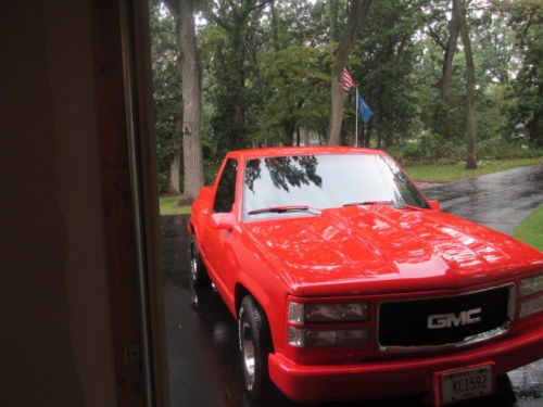 1992 GMC short bed step side show truck. This truck was professionally built by a 30 year body shop manager. The work was done in the Spring and Summer of 2010. It was done right and it has 16,769 miles on since restoration. The restoration besides all body work includes: Summit power engine kit with forged pistons 9:72, summit cam kit, all ARP bolts, summit gear drive, new flywheel, summit shorty truck headers, holly 670 street avenger carburetor with electic choke on a Edelbrock air gap intake. B & M truck mega shifter with 2400 stall converter and shift kit. Rally wheels with SS knock offs, 60's on the front and 50's on the rear tires, 342 read end gears. Cowl induction hood, shaved power door locks, shaved rear tailgate. INTERIOR: Gauges, carpets, leather seat covers, CD player, new grill with smoothed front bumper, and new steering wheel. The paint on the vehicle is Skittle Red Orange by DuPont. Has new heat and air controls panel. This truck is nearly perfect. Runs as good as it looks. Over $25,000 invested. This was a complete bodyoff restoration. Have all receipts for the overhaul of the 350 engine with Vortec heads and have the receipts for the complete rebuild of the transmission. The engine was rebuilt March 1, 2010, by Engine Rebuilding and Installation Machine Shop in Collinsville, IL. Transmission rebuilt by the same shop. Total engine and transmission cost was $5,681.65. We've had the truck approximately a year and a half and put on roughly 3,000 miles. The gentleman we purchased the truck from was in his seventies and only drove the truck on nice days or to car shows. We have done the same. Truck has never been out in snow or rain since we've owned it. Taken pictures of undercarriage and it looks as good as the rest of the truck. Same for under the hood and interior. All I can say is that this is a great truck and would make someone proud to own it. The truck is located in Beloit, WI. Require a $500 deposit is due within 48 hours at the end of the auction. The rest to be paid when truck is picked up within 7 days. If you win the auction and come to pick up the truck and you do not like the truck or the way it looks and thinks it was decribed wrong your $500 will be returned to you. Thats how sure I am that you will like the truck. If you have any questions regarding this truck please call (573) 243-8459.