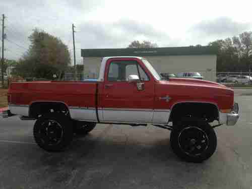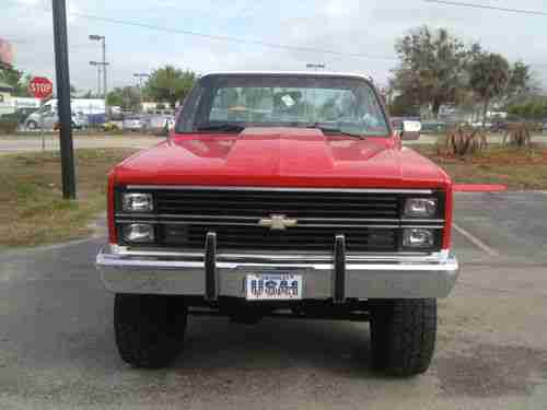 This is a 1984 Chevrolet Silverado Short Bed with factory AC. It has a beautiful paint job that was done a few years back, still looks great. Has a 350 motor, with a 700R4 Transmission with under 1k miles in it. Brand new edelbrock performer carb, victor JR intake, series 7 ignition system, brand new MSD wires. 2 Brand new fuel tanks and selector valve. I had the front and rear axles rebuilt about 6 months ago, and had 4.56 gears put in, new lockers, new u joints, custom front and rear drive shafts, and new manual lockers. I still have receipt from advanced driveline for $3k for just the driveline work. Has brand new gear reduction starter. Has 35X12.50X20's that are still in great shape. Interior carpet, visors, steering wheel, door panels, and seat are all brand new, and show no signs of wear. Has a pioneer cd, and custom speaker box. This was not a cheap paint job, everything was taken apart, and all new seals were installed, along with a new rear window. I'm sure I'm forgetting something, I have well over 20k into this truck, and it hardly ever leaves the garage. Looking for someone that know's whats here, and can appreciate the time and money that went into this beautiful truck. Truck is listed locally for sale, so I do have the right to end auction early if it sells locally. If you have any questions, I can be reached at 407-443-8889.