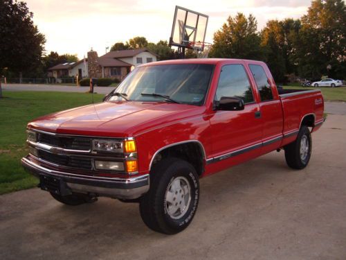 You are viewing my 98 Silverado xcab 4 wheel drive pickup that runs and drives great and does have the 3rd door! It is powered by a V8 engine (I dont know which one since the tag has been scratched up) and an automatic transmission. The 4 wheel drive works as it should and the truck has alot of power. It has power windows, power locks, tilt, cruise, aftermarket cd (will not power on), cold air, factory alloy rims, white lettered tires (about 60-65% tread), and all equipment, other than radio, works. The red paint is shiny but has some nicks and dings as you would expect from a 98 model, not collision damage, just normal stuff. The gray cloth interior is in very good shape for 16 years of wear and tear. There are pics of the bedsides, rocker panels, and the cab corners to show the truck is not rusty. I am not saying it may not have been repaired before I bought the truck, just that it is not rusty now. The inside of the bed is in great condition also for a 98 model (see pic). I bought this truck from a new car store and cleaned it up and drove it around some and it runs and drives quite well, sounds good too with a low rumble exhaust tone! I would have no concerns at all to drive this truck anywhere. I am a licensed and bonded Missouri dealer and have been for 29 years, so you can buy this truck with confidence that it will come from an honest seller with more than a year or two of experience. I will answer your questions honestly as I check my email several times a day, and will take any other pics you may want to see if they are not already in the ad. I expect payment in full within 5 days of auction ending in the form of cash or bank wire transfer only! If the high bidder has a low feedback rating, I will require you to contact me before the auction ends or I will cancel your bid, sorry. I know what these trucks bring on eBay most of the time, as I have watched them recently, and I can say this one has a lower reserve (please don't email and ask the reserve, just bid to see) than almost all of them I have watched end, so bid to own it! Please have your funds already set up before bidding too please. Thank you for considering my 98 Silverado xcab 4 wheel drive!