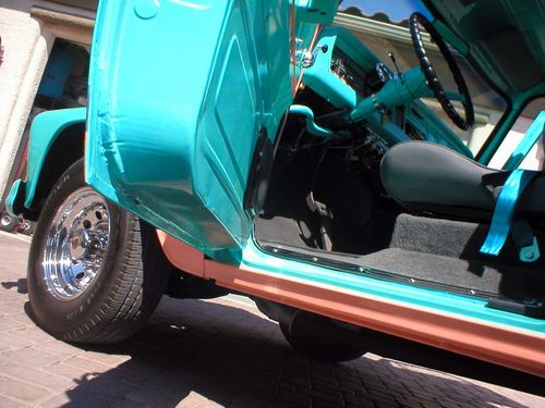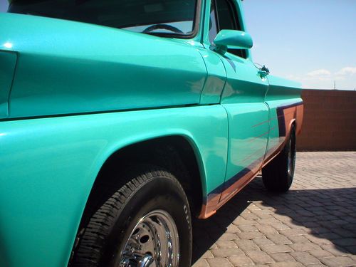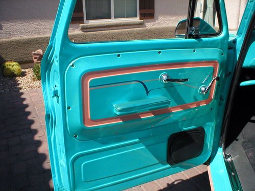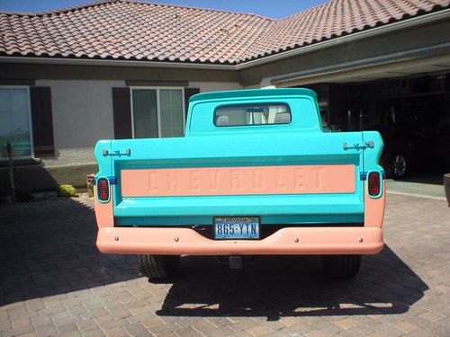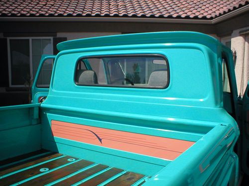 THE PICTURES TELL THE STORY ON THIS SHARP BLAST FROM PAST. SIXTYS TRUCKS WERE THE BEST LOOKING AND HIGHLY SOUGHT AFTER. THIS TRUCK GETS THUMBS UP WHERE EVER I DRIVE IT. ITS ALSO A BIG HIT AT LOCAL CAR SHOWS AND DRIVE INS. TRUCK STARTS,RUNS AND DRIVES VERY WELL. THERE ARE TWO ITEMS I WANT TO DISCLOSE (1) THE SHIFTER WORKS FINE BUT IS LOSE AND WORN. (2) ENGINE RUNS GREAT BUT HAS THE TYIPECAL SMALLBLOCK REAR MAIN SEAL LEAK.THESE WILL NOT STOP THE OPERATION OF THE TRUCK IN ANY WAY. I AM ALSO OFERING FREE SHIPPING TO THE FOURTY EIGHT CONTINANTIL STATES IF RESERVE IS MET. THE RESERVE PRICE IS VERY LOW FOR WHAT YOU GET. THIS TRUCK COULD BE ONE OF THE BEST LOOKING ON E-BAY CURRENTLY. PLEASE ASK QUESTIONS I WILL ANSWER UNLESS THERE FOOLISH. IM A CREDABLE E-BAY TRADER WITH GREAT FEEDBACK. BID NOW TO HAVE SOME GREAT FUN DRIVING THIS HOT ROD PICK UP. ITS VERY UNIQUE NO ONE HAS ONE QUITE LIKE IT. THANK YOU AND GOOD LUCK BIDDING!