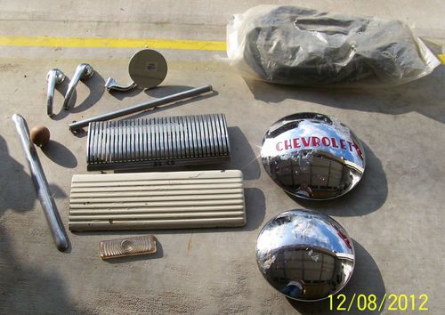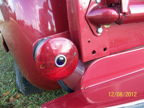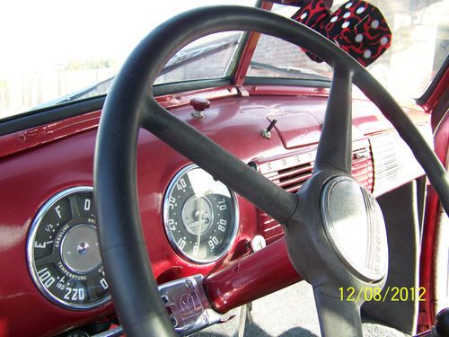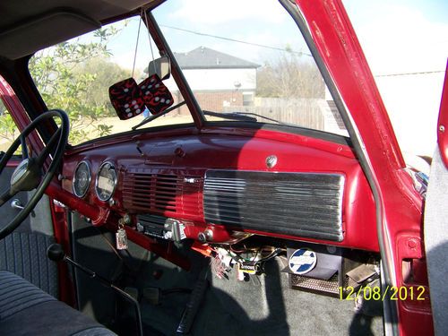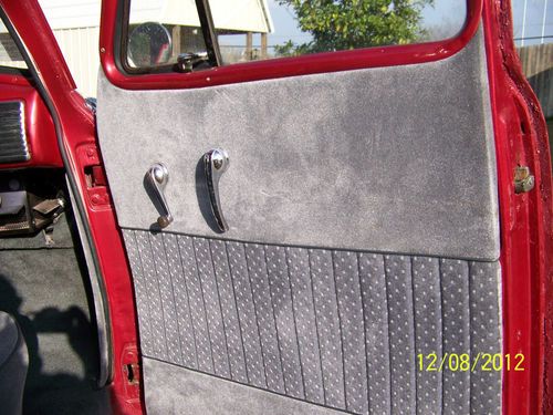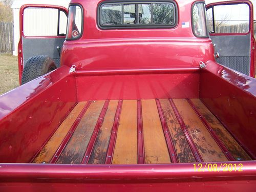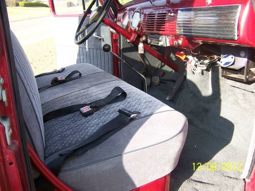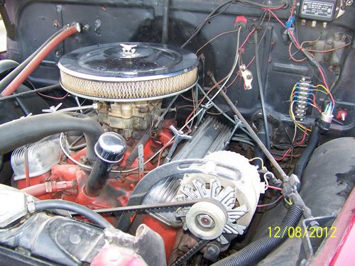 About 400 miles on rebuilt 283 cu./in. Chevy engine w/duel exhaust. Has 3-speed transmission w/floor shift, Grey tuck & rolled velvet upholstery, Heater, radio w/CD player, Oak floor bed, American Classic wheels w/baby hubs.