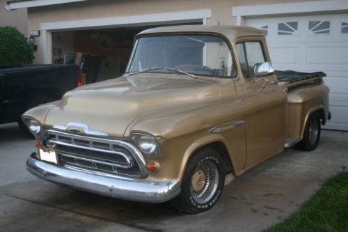 This is a second owner pick up. This truck has been in the family for over 35 years. It has been sitting in the driveway. This was a daily driven car, but it has been sitting since December and we have no time to restore back to original. The body has rust it has a strong 350 engine 2 barrel, carburator needs to be rebuilt, turbo 350 transmission. The lines are leaking I believe it needs o-rings. It has disc brkes it has front clip of Nova and a Rear end from a Camaro. It is a nice Truck for someone that has time for it. Remember it is a 1957 and it needs TLC but it is ot bad.