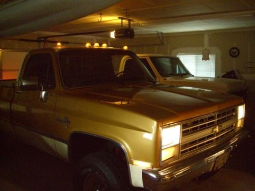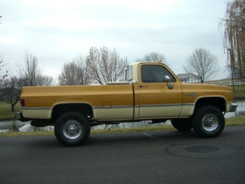 BRAND NEW REUPHOLSTERED SEAT FABRIC...WAS A SPECIAL ORDER FABRIC BRAND NEW CUSTOM CARPET FROM UNDER DASH TO BACK OF THE CAB!! BRAND NEW HEADLINER DOOR PANELS LOOK FANTASTIC...SEE PICTURES INCLUDES A COLOR MATCHING DASHMAT FOR GLARE AND DASH PAD PROTECTION....DASH PAD HAS ZERO CRACKS! NON-SMOKING TRUCK SINCE BRAND NEW ALL GLASS IS IN GREAT CONDITION...ONE VERY SMALL FILLED ROCK CHIP ON PASSENGER SIDE EVERYTHING WORKS....DUAL GAS TANKS, LIGHTS, CRUISE CONTROL, A/C, GAUGES, ETC...ETC...ETC... PLUS, THE TILT WHEEL IS STILL TIGHT LIKE FROM THE FACTORY...TILT COLUMNS USUALLY GET LOOSE FROM PEOPLE GRABBING THE STEERING WHEEL UPON ENTERING THE TRUCK...ASK AROUND ABOUT THAT LITTLE FACT. DID I MENTION THAT THE CRUISE CONTROL STILL WORKS....VERY VERY RARE!!!!!!! FACTORY WINDOW CHANNELS AND DOOR SEALS STILL IN AWESOME SHAPE!! ONE OWNER TRUE 1 TON 4X4 WITH ONLY 97K ORIGINAL MILES!! I KNOW WE ARE MISSING MANY MANY MORE NEW TO NEWER ITEMS ON HIS TRUCK BUT I AM SURE YOU ARE GETTING THE PICTURE...THIS IS A SERIOUSLY SOUND RUNNING AND DRIVING TRUE 1 TON 4X4 WHICH LOOKS AMAZING. THE RESERVE PRICE IS A STEAL FOR WHAT YOU WILL BE GETTING. FINDING ONE THIS NICE IS LIKE FINDING A NEEDLE IN THE BIG HAYSTACK.... WITH ALL THE FACTORY GOODIES THAT ACTUALL WORK. BETTER BUILT TOOL BOX IS NOT INCLUDED....IT IS AN ADDITIONAL $250.00 ON TOP OF THE SELLING PRICE OF THE TRUCK...INCLUDES SLIDING TRAY AND A CUSTOM MADE BOX THAT LAYS ON THE BASE OF THE TOOL BOX AND ALSO SLIDES BACK AND FORTH...VERY NICE FEATURE. Additional pictures here....copy and paste into new browser http://s985.photobucket.com/user/bigdog58/library/1984%20Chevrolet%20K30?sort=3&page=1 SHOULD YOU HAVE ANY QUESTIONS, SHOOT ME A CALL SHOULD YOU HAVE AN OFFER...PLEASE LET ME KNOW AS IT IS FOR SALE LOCALLY AS WELL AS ANOTHER SITE....PLEASE DO NOT INSULT ME WITH LOW BALL OFFERS...I KNOW HOW RARE THIS FACTORY ONE TON TRUCK IS AND HOW HARD THEY ARE TO FIND IN THIS CONDITION.