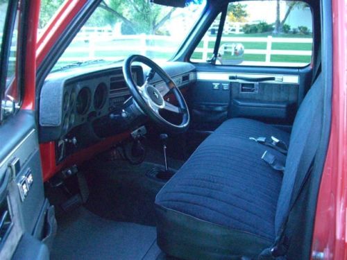 ALL FACTORY INTERIOR TRIM INCLUDING HEADLINER, DOOR PANELS, CARPET AND DASH PAD BRAND NEW REUPHOLSTERED SEAT FABRIC IN THE FACTORY MATERIAL, COLOR AND TEXTURE...WAS A SPECIAL ORDER FABRIC CARPET, HEADLINER AND DOOR PANELS LOOK FANTASTIC LECARRA STEERING WHEEL $189 INCLUDES A COLOR MATCHING DASHMAT FOR GLARE AND DASH PAD PROTECTION NON-SMOKING TRUCK SINCE BRAND NEW ALL GLASS IS IN PERFECT CONDITION...NO ROCK CHIPS, CRACKS, PITTING OR SCRATCHES ANDYWHERE!! EVERYTHING WORKS....DUAL GAS TANKS, LIGHTS, CRUISE CONTROL, A/C, GAUGES, POWER WINDOWS, POWER LOCKS, ETC...ETC...ETC... PLUS, THE TILT WHEEL IS STILL TIGHT LIKE FROM THE FACTORY...TILT COLUMNS USUALLY GET LOOSE FROM PEOPLE GRABBING THE STEERING WHEEL UPON ENTERING THE TRUCK...ASK AROUND ABOUT THAT LITTLE FACT. DID I MENTION THAT THE CRUISE CONTROL STILL WORKS....VERY VERY RARE!!!!!!! FACTORY WINDOW CHANNELS AND DOOR SEALS STILL IN AWESOME SHAPE!! THEY WERE ALSO REMOVED PRIOR TO PAINT SO NO OVERSPRAY ON THE FELTS OR RUBBER WEATHERSTRIPS