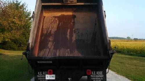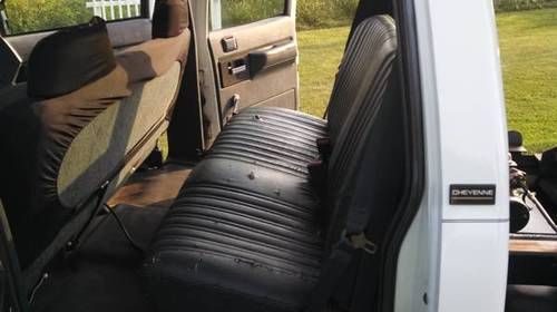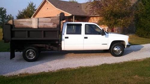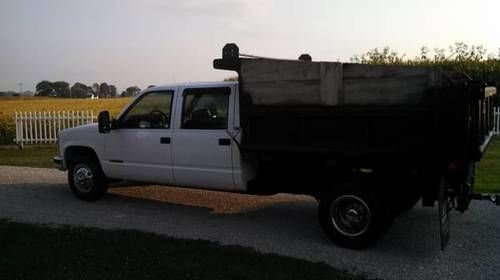 1993 Chevy C3500 crew cab dump, truck has 126,XXX, 350 engine, automatic, CD player, rubber floor mat and manual crank windows. Title states that miles are not actual due to being over 100k miles. All floors all solid no rust in floor boards, front seat has fitted seat cover back seat has some snags and tears but overall good shape. Dump is a gravel type dump with 3 way tailgate. Dump is electic over hydaulic. Dual batteries, no cracks in dash, hand crank roll tarp on head-ache rack. Truck has no rust and no dents cab was just redone with a textured matching paint along rocker panels for chip guard protection. All matching Firestone tires with excellent tread. Mechanically truck has new larger radiator and water pump, all new brakes front and rear. The front brakes have new pads, calipers, hoses. The rear has all new hardware and pads with hoses. I also had new rear wheel seals and axle seals installed. The truck has aftermarket chrome simulators. I have recently replaced the fuel filter, changed oil, new MAP sensor, new TPS, new plugs, new wires, distributor cap and rotor, and temp. sensor. Truck was Ziebarted when new. Does not look and drive like an old dump truck has been very well maintained. Truck is 2wd and never had a plow installed. The truck bed has no waves and is very straight.