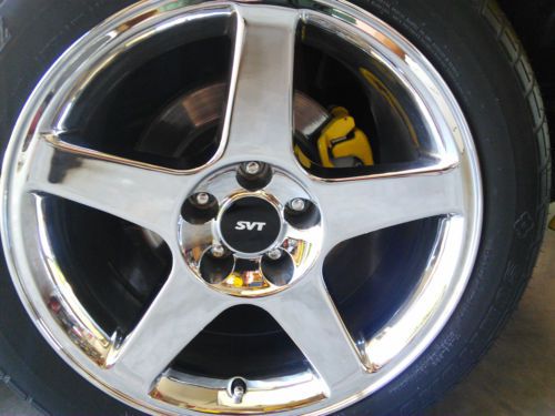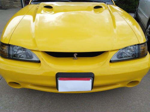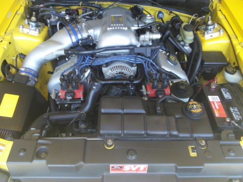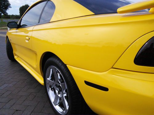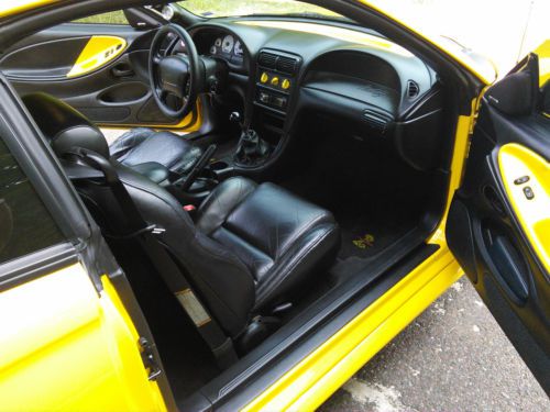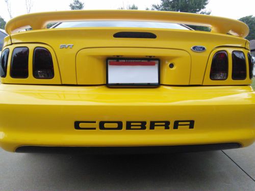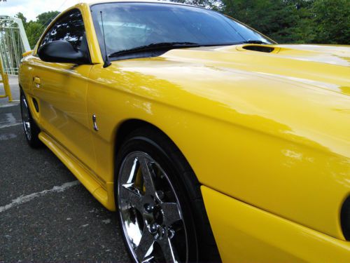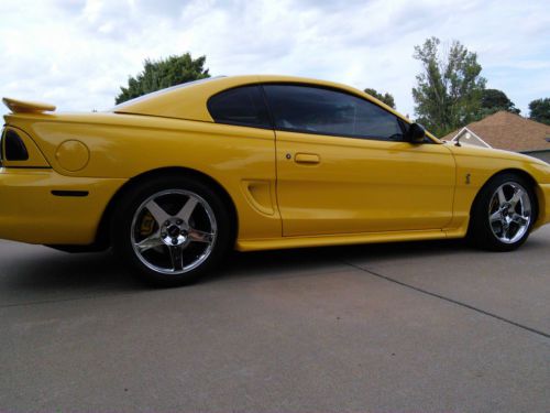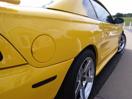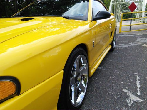 #1746 of 5174 & 1 of 704 Chrome Yellow 98 Cobras w/Black Leather. This car was originally a California car and was there from 1998 to 2012. It is in excellent condition both visually and mechanically with no leaks, rust, or problems. Everything works as it should and it has a clean Autocheck. Here is a list of extras on the car. Offroad X pipe, Flowmaster 40's, Eibach Pro Kit lowering springs with KYB adjustable shocks and struts, MSD ignition, 355 ring and pinion, 03' Terminator wheels (17x9 f & 17x10.5 r and are flawless, Hurst shifter, Pioneer stereo, tinted headlights, tinted wdws., gage pillar oil pressure and voltage gages (never hooked up), shorty antenna. I just put new tires on the front and the rears are aprox. 60% tread. Fire extinguisher mounted in rear floor area. I changed all the fluids in the car recently using full synthetic including the rearend, tranny, engine oil. Also has new coolant and brake fluid along with all others topped off with no leaks. I just replaced the reverse light switch along with a new idler pulley and tensioner assembly. Also just put new rear brakes on and fronts are aprox. 50%. I also just put a BBK clutch cable, quadrant, and firewall adjuster on as it still had the original cable and quadrant, The interior is in great condition with the drivers seat showing normal wear but no rips etc. Previous owner had just put a new Motorcraft battery in it 6 months ago. I also put a JLT catch can in line between pcv valve and intake to catch any oil vapors which is helpful on these engines. It also has Griggs billet caster /camber plates on it along with a C&L cold air kit. I believe that is a fairly complete list. As far as any flaws...it has a very small ding in the bottom of passenger door along with a few very minor chips that are difficult to see. The windshield is pitted (no breaks or cracks) from I assume normal wear and I would most likely put a new one in it in the future if I wasn't selling as I am kind of a perfectionist but not a huge deal. This car is an eye catcher and is very mechanically sound and visually excellent. The stance of it draws alot of compliments. Buyer will be responsible for setting up and paying for shipping unless otherwise agreed upon. I may be able to ship it as I have shipped several in the past but shipping costs would need to be negotiated between myself and the buyer. I am selling this car as is but I am 52 yrs. old and very picky and will not sell junk. I have fairly meticulolusly gone over the car and it will make someone a great ride. It recently won 1st place at a show in The Rocky Mts. with previous owner which should give an idea of it's condition and appeal. Contact info. 417-224-2926 ***THIS CAR BID UP TO WITHIN A FEW DOLLARS OF IT'S ALREADY REDUCED RESERVE PRICE IN AUCTION THAT JUST ENDED. (LITERALLY A FEW DOLLARS)! I AM NOW OFFERING FOR A "BUY IT NOW PRICE" FOR LESS THAN PREVIOUS RESERVE. THIS CAR IS GOING TO MAKE SOMEONE AN AWESOME BUY CONSIDERING I WASN'T GOING TO GO THIS LOW. I AM PREPARING TO GO ON A TRIP SOON AND AM OFFERING IT AT A GREAT PRICE AND IT'S CONDITION IS JUST AWESOME. IT WILL GO UP IN PRICE LATER AS I SELDOM DRIVE IT AND AT 52 YRS. OLD I WILL JUST KEEP IT. SOMEONE CAN GET A G R E A T DEAL ON THIS THING. THANKS FOR LOOKING. Contact info 417-224-2926