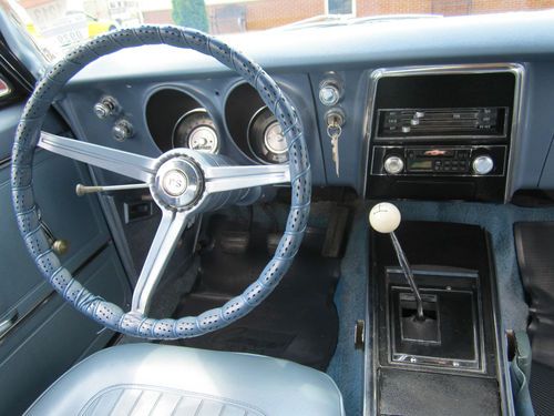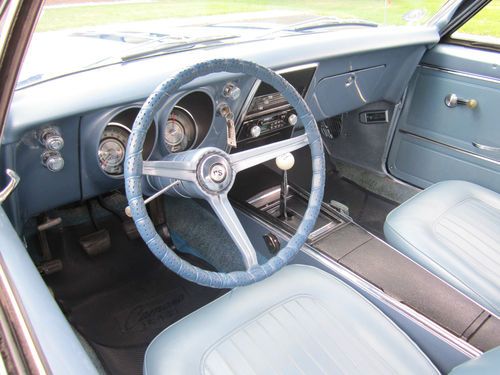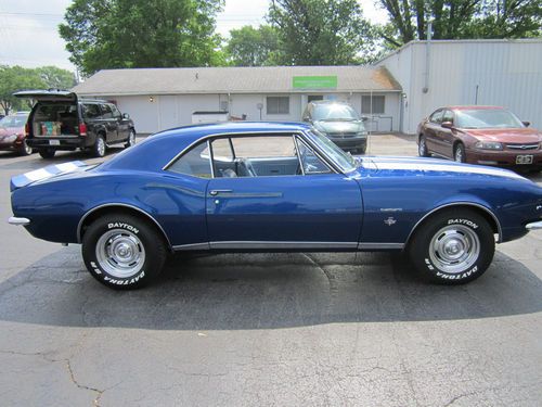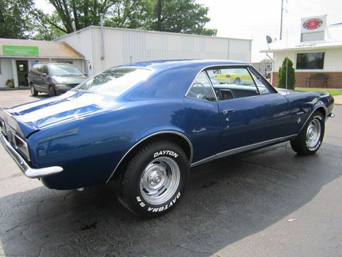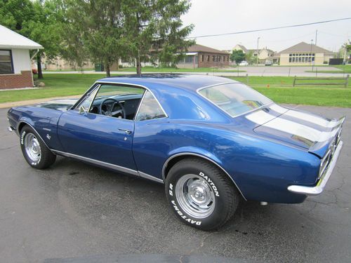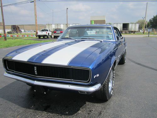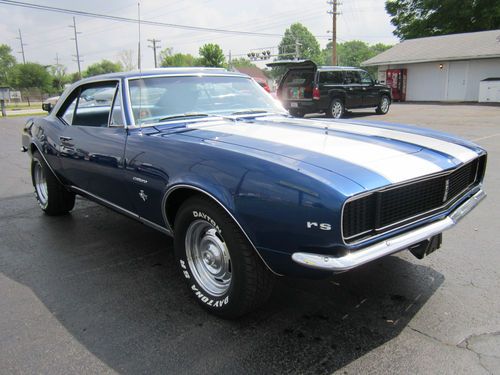 1967 Chevrolet Camaro RS. This is the real deal. FULLY RESTORED. It has the original 327 V-8 rebuilt- bored and rehoned, stainless steel valves, high performance cam(police cam option) producing around 400 hp. It has a 750 Holly double pumper carburetor & electronic ignition. It has a 4-speed M21 Muncie heavy duty transmission w/ Hurst shifter. The rear end is 12 bolt, limited slip w/traction bar. It runs, sounds and drives great. Interior is perfect using all OEM- headliner, seat covers & carpet. Repainted the dash the original color. The exterior of the car is laser straight and was stripped down to bare metal and painted 2004 GMC Marine blue w/ pearl white stripes(it was originally a factory blue car) which looks flawless. Wheels are chrome corvette rallys w/ new tires. It has the original spare tire which has never been on the ground. It was totally restored in 2004 and driven less than 1000 miles since. It has always been garaged and trailered to car shows. Family owned since the 1970's. Has won multiple show awards. IF YOU WANT A CAR YOU CAN BE PROUD TO OWN, THIS IS IT. Good Luck Bidding!!!