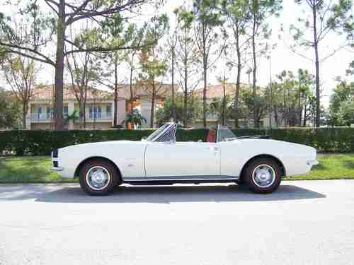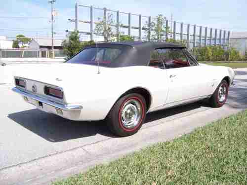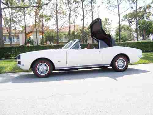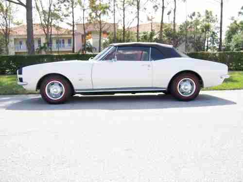 For sale is a very nice driver condition 67 Camaro convertible. It has the original engine and trans, the rear I'm not sure about yet but it is a 12 bolt and it has the single small block traction bar. The vin number is on the front pad and I have a picture of it. I also have the original Dealer invoice from Carter Chevrolet in Manchester CT. As per the cowl tag and invoice, this is an original Ermine white/Red interior car. It also lists 13 other options on the invoice. This car was delivered new with Aux. lighting, P.S., SS 350, Rear Antenna, Console, Rally Sport, Gauges, Power Top, Positraction, Power Glide Trans. and AF heater and defroster. It has a set of Ralleys and Redlines on it now. This paint on the car appears to be 8/10/12 years old but shows very well. It has a couple of slight chips and scratches but nothing that really stands out. I would rate it a good 7.5. The bumpers and stainless trim also show well. The interior looks good also, it still retains it's original seat belts with the dated tags on them. the trunk is solid and all 4 cocktail shakers are present. All the lights and gauges also work as they should. There are also no issues with the power top, it goes up and down with ease. This car is a very nice little driver. For any further questions please feel free to call 954-465-9357 Mike PS, I'll have the exact casting and date codes from the drivetrain soon.