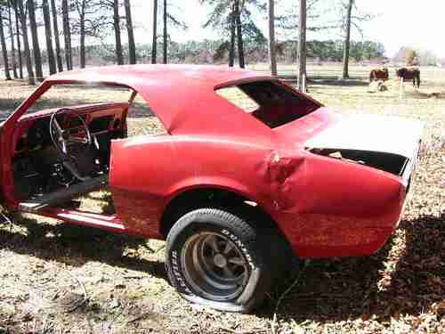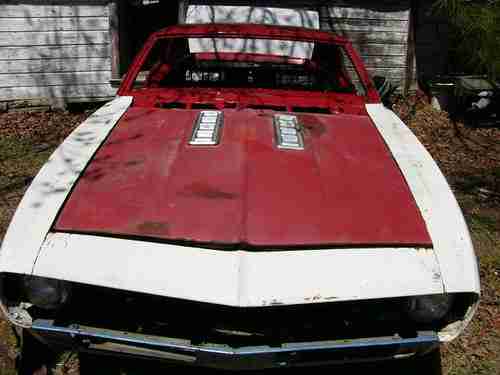 1967 Rally Sport Camaro, Rolling Body/ Parts Car. Please review the pics closely and list of parts that come with the car. There are no other parts available other than what is listed.There is no vin tag, title, or cowl tag. The dash is very good, with gauges, orginal brake/gas pedals, firewall, subframe is very nice. Has the factory 10 bolt rearend. I have 2 complete doors with windows and 1 door without window, 2 new door skins, 2 new frame rails, 1 -1968/69 SS hood with louvers, 2 nice front bucket seats for 67 , 2 tail light assemblies. The wheels and tires on car are old ,but do hold air for a day or so. This car would make a nice drag car or for parts for your project. The driver quarter panel was damaged by a wooden beam being dropped on it while building a shop and is repairable.. The front end is a rally sport front end but is missing parts as you can see. I had a 67 and bought this car for parts, I now have a 69 and just don't need. Not willing to sell parts. If you have questions please call me at 919 920 0136.