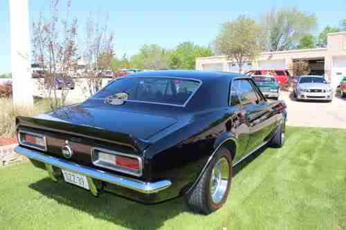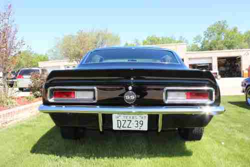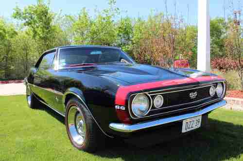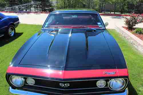 1967 camaro ss, 350 v8 makes 345 hp on the dyno. Complete restoration by Advantage Autoworks in north texas. $68,000.00 dollars in restoration invoices alone. Rostissarry restoration done at the highest level possible. Every nut , bolt , and clip has been replaced, re plated, or repainted. Black exteriro, red delux interior.Fold down rear seat, vinatage air ac added, has posi trac rear end with rh rear factory traction bar rear end, 373 gears, upgraded 700 r4 overdrive trans, 350 1967 block cast code correct, disk brakes ,pwr steering. factory gage package with tach,new am/fm factory look radio( $600.00 bucks alone) Paint and body is 2nd to none. Undercarrage is correct red oxide. This car has had every exterior panel replaced and gaps are perfect. zero rust on floors , trunk, etc.... pristine body with no surprises. Have extensive retoration photos to doccument restoration. Can be seen in the fort worth texas area. Call chris at 817-773-1852 or e mail chris@advantageautoworks.com . If you are looking for a very high end restored car with please call. This is no fire sale , so please bid only if you are seriouse.