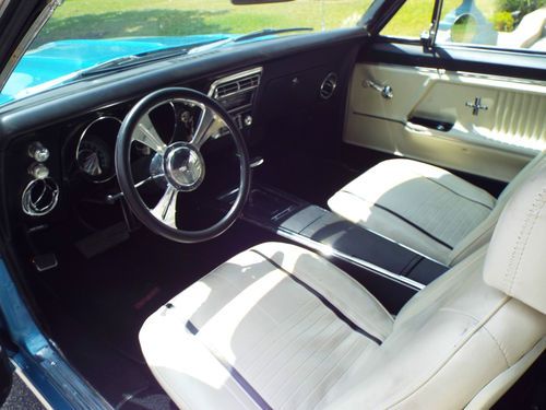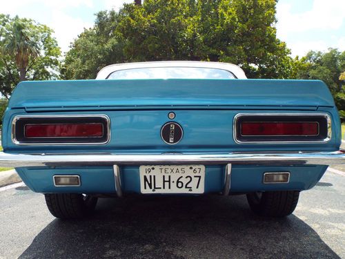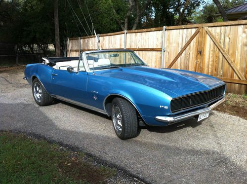 Beautiful 1967 Camaro, True Rally Sport Convertible in Marina Blue is in good condition with a few small paint dings here and there. This car has always been kept in the Garage. I bought it in 2007 and was told it was painted about a year and half earlier. I have put less that 3000 miles on it since buying it. After I got it, I had the Cowl hood painted to match and installed and put these foose 17" wheels with BF Goodrich tires on it. Interior was done at the same time as the paint. I have the original hood and many other parts to go with it including, carb, intake, valve covers, alt, lots of small interior pieces etc. Car runs well and drives quite nice. It has an am/fm cassette radio with an ipod input cable. it has a 327 with 275 hp. I was told the motor was rebuilt in 1997. It has factory air with a 2 year old or so compressor. Brake lines were replaced a few months ago. Billit specialties steering wheel and valve covers, edlebrock intake and carb.It's a nice car. Number on the engine block is TI0I3MM. I was told that it is not the original motor but is of similar age but I am not expert on such identifying. Looks like the floor pans under the back passenger seats were replaced also.I've had my fun with it and now it's time to get something else. You shouldn't be disappointed with it. All shipping is the buyers responsibility, including additional car parts if you want them. Please ask all questions before bidding. Please make sure you have your wife's permission.