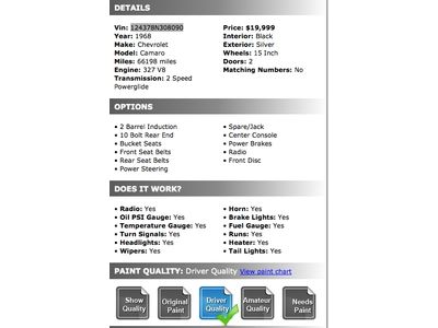 1968 Chevrolet Camaro 327 V8 2 Sp Powerglide Pb Ps Bucket Seats on 2040-cars