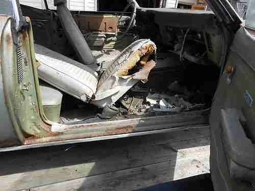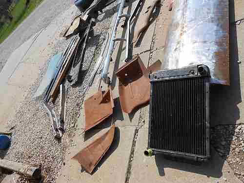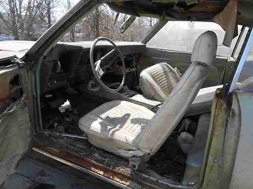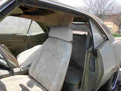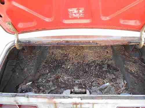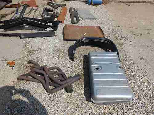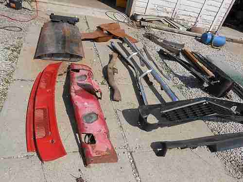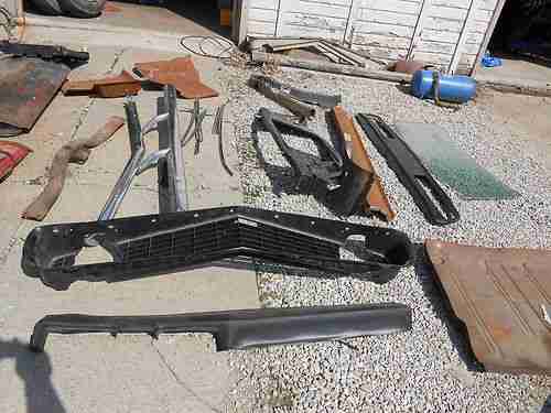 Good used parts: Front buckets and rear seats in car, need recovered. Dash pad, better pass door, another set of front fenders for patches or repair, front bumper, rear bumper, good upper and lower valance, cowl, extra rad support, extra inner fender wells, good used grille, set of front and rear window trim, sill plates, rear glass and quarter glass, nice trunk lid, rear spoiler, fuel tank with sump.