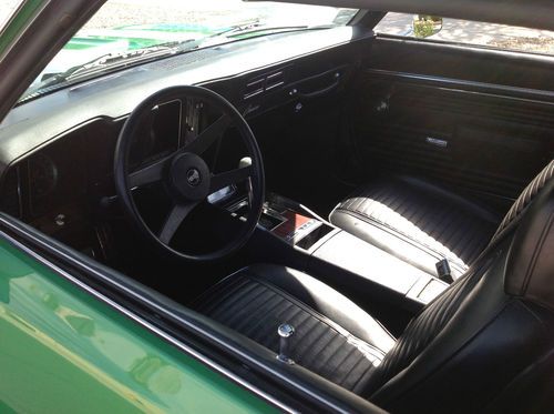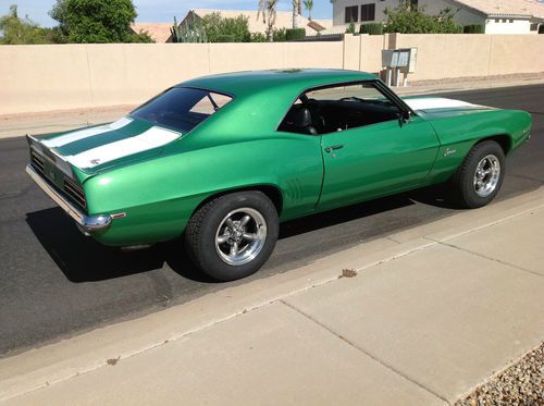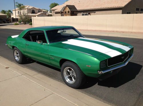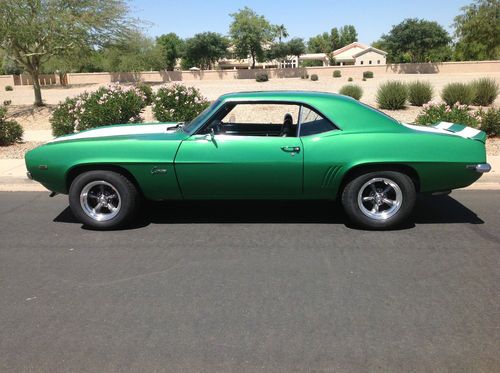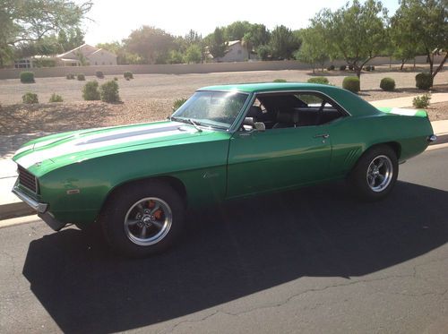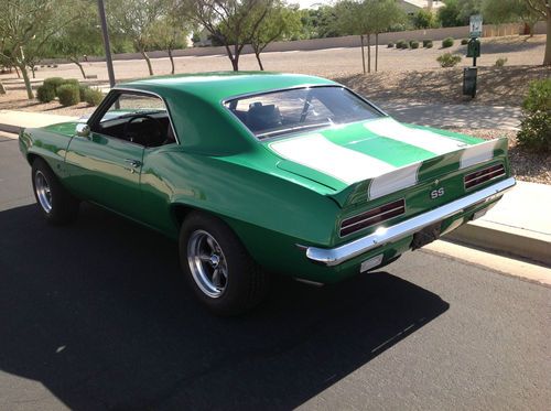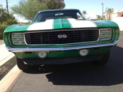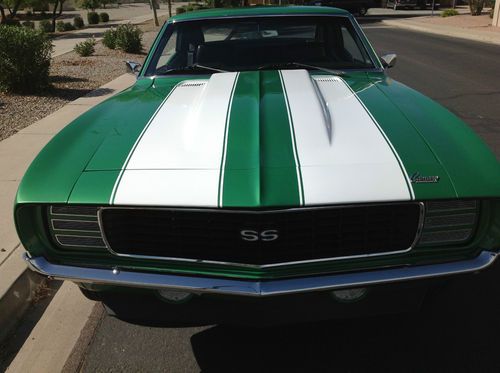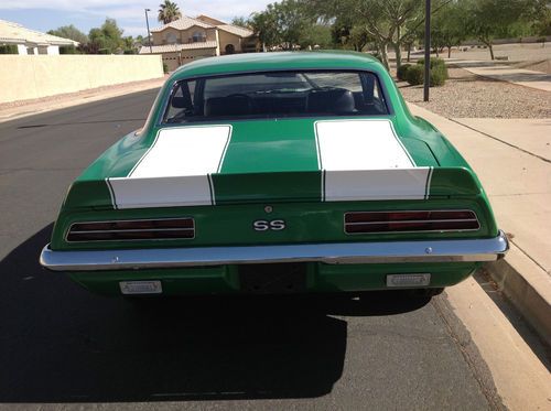 This is a 1969 Chevrolet Camaro RS SS tribute. It is powered by a very nice running NOM 350 engine, backed by a Muncie 4 speed transmission. It has power steering and power disc brakes. Always an Arizona car, and located in Gilbert, Arizona. It is painted in the original color of code 79 79 Rally Green. Only 5.4 percent of all 69 Camaros left the factory painted this color. It has a new aftermarket air conditioning system that blows ice cold. The car has new tires and wheels. It has new weatherstripping, chrome trim, interior kit, brakes, and new suspension kit front and rear. It drives very nice. Also new are the electric operated hideaway headlamps. If you have additional questions, please call 435-770-3337.