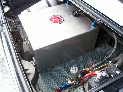 The fuel system feeding this Big Block consists of a new 16gal aluminum fuel cell , with fuel level sending unit , located in the trunk . The fuel is pumped through the 10AN Stainless Steel braided fuel line by a Holley electric fuel pump , also located in the trunk . The fuel is filtered by a 10in inline aluminum bodied , Stainless Steel mesh media fuel filter to a Quick-Fuel fuel log with two Quick-Fuel adjustable aluminum regulators , one for the carb and one for the Nitrous system .