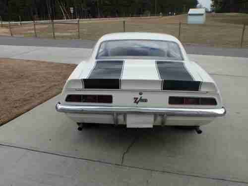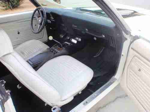 RARE FIND 1969 CAMARO Z 28 RUNS AND DRIVES GREAT NO ISSUES VERY TIGHT AND VERY STRONG 350 STAINLESS EXHAUST 4 SPEED 410 POSITRACTION 12 BOLT REAR 302 ENGINE DISSAPEARED SEVERAL YEARS AGO BUT TRANSMISION AND REAR END ARE CORRECT THE PAINT CODE IS 50/50 WHICH IS WHITE ON WHITE PAINT IS FRESH ON HOOD AND DECK LID INCLUDING THE BLACK STRIPES THE REST OF THE BODY NEEDS ANOTHER COAT OR TWO AND CLEAR INTERIOR IS ORIGINAL AND IS IN GOOD SHAPE FOR THE AGE A NEW HEADLINER STILL IN BOX IS INCLUDED DOOR/WINDOW HANDLES, EMBLEMS MIRRORS AND CHROME IS INCLUDED AND ALL IN GREAT SHAPE HAS POWER STEERING POWER DISK BRAKES ALSO HAS TAC, CLOCK , AND IN THE CONSOLE A FUEL GAUGE OIL PRESSURE VOLTAGE GAUGE AND TEMP GAUGE + RALLY WHEELS WITH NEW TIRES IT WOULDNT TAKE MUCH TO MAKE THIS CAR A TEN ANY QUESTIONS CALL ME 678-471-1958 GEORGIA TITLE IN HAND PICTURE OF TRIM TAG IN LISTING PICTURES WERE TAKEN 2-28-13 ****TRUE MILEAGE UNKNOWN WILL BE SOLD AS EXEMPT ++++WINTER REPLICA ALUMINUM INTAKE +HOLLEY DOUBLE PUMPER NEW +DOUBLE HUMP HEADS +CORRECT FINNED ALUMINUM VALVE COVERS THE UNDERSIDE OF THIS CAR IS VERY CLEAN AND THE BODY IS VERY SLICK NO DISSAPOINTMENTS. Below the dash a correct option D55 center console houses correct option U17 four pack gauges and a completely chrome Hurst short throw shifter in a great looking wood trimmed shift plate. Below the console, correct black carpet is bordered by chrome Fisher Body sill plates.